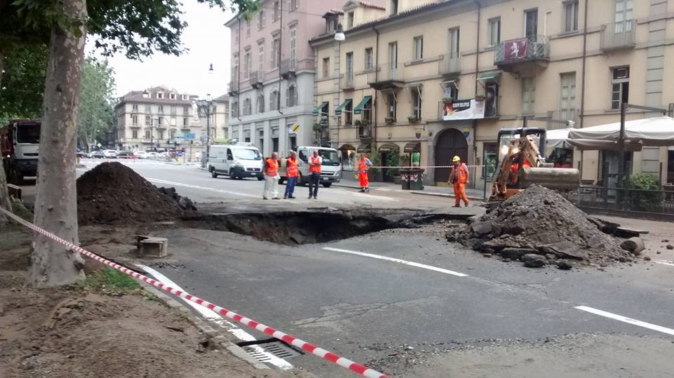 La polizia municipale comunica che nelle prime ore di questa mattina, venerdì 12 giugno, a Torino, si è aperta una voragine quasi in piazza Gran Madre che impedisce ai veicoli di percorrere corso Casale e corso Moncalieri, obbligandoli a circumnavigare la piazza. I tecnici Smat sul posto per risolvere al più presto il problema. Si prevedono però fortissimi disagi alla circolazione per tutta la giornata di oggi. La voragine si è aperta a causa della rottura di una tubazione dell’acqua.