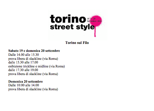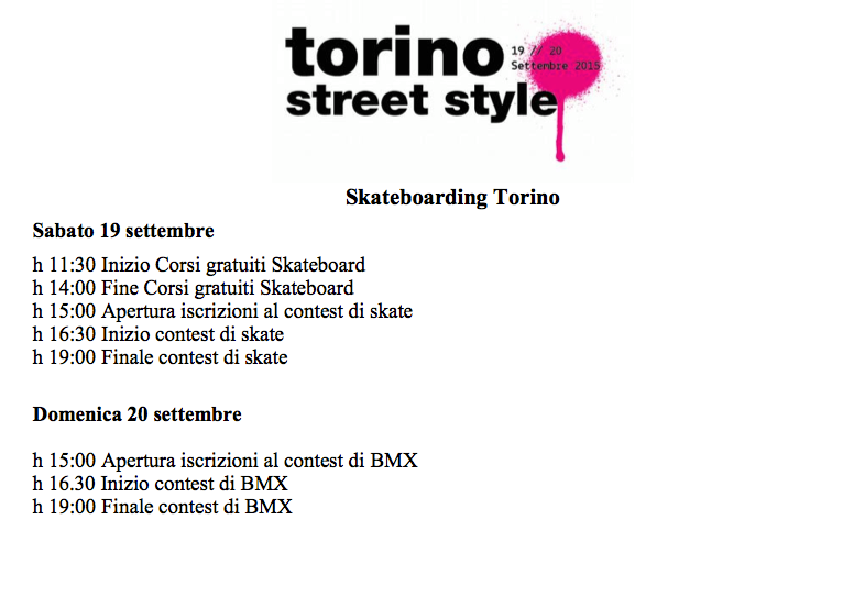 Si svolgerà sabato 19 e domenica 20 settembre la Torino Street Style 2015. Si tratta di un evento dedicato agli sport di strada durante il quale le varie associazioni cittadine che si occupano di questo tipo di attività mostreranno i loro programmi per la nuova stagione e metteranno a disposizione di chi vuole provare la loro esperienza e i loro attrezzi.