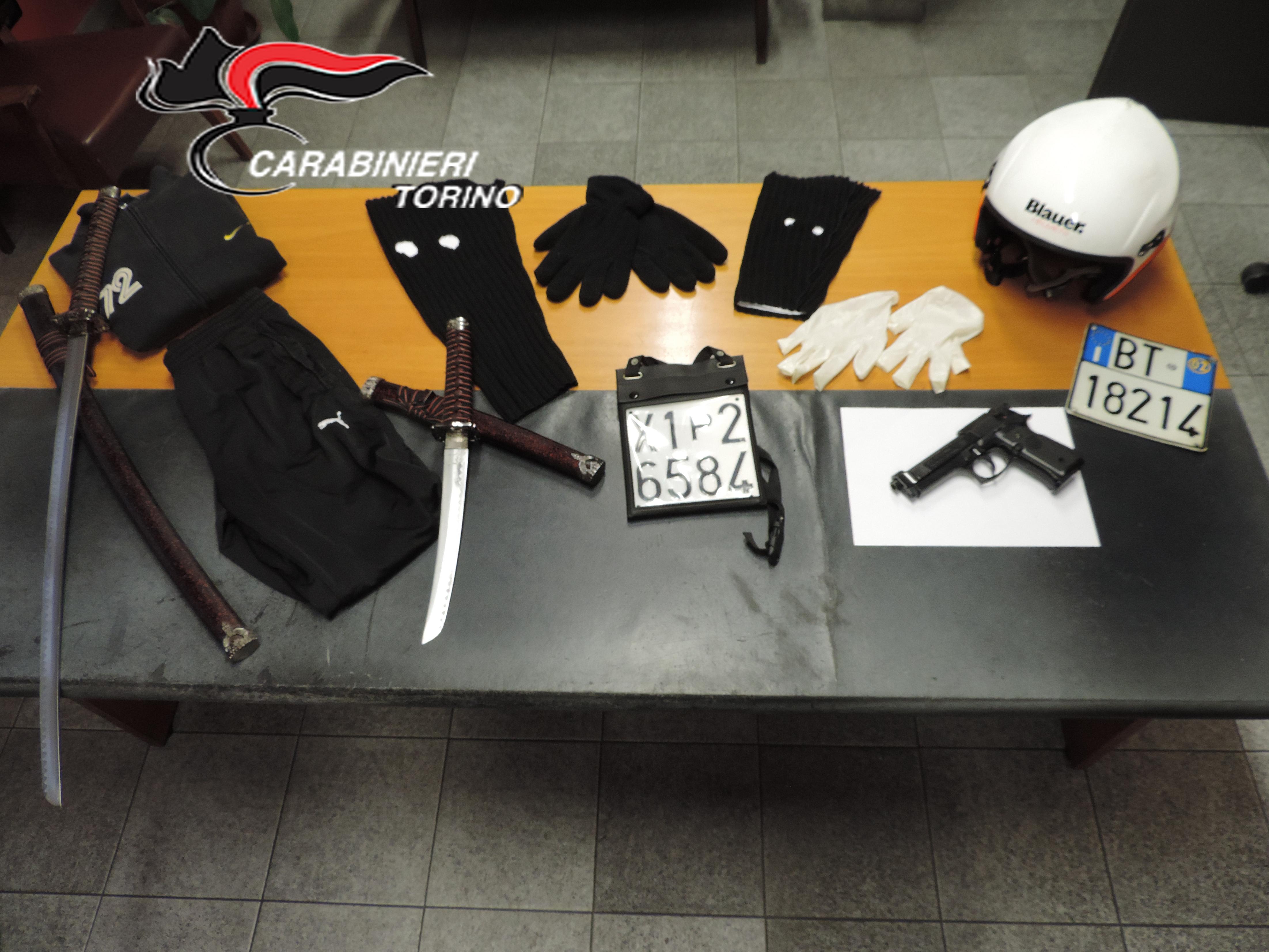 Le perquisizioni presso le abitazioni degli arrestati hanno permesso ai carabinieri di sequestrare una pistola Beretta modello 92/fs, una fedele replica di ferro alimentata a gas, alcuni passamontagna, un casco integrale, guanti in lattice, targhe false, alcuni coltelli e katane e  3 cellulari.