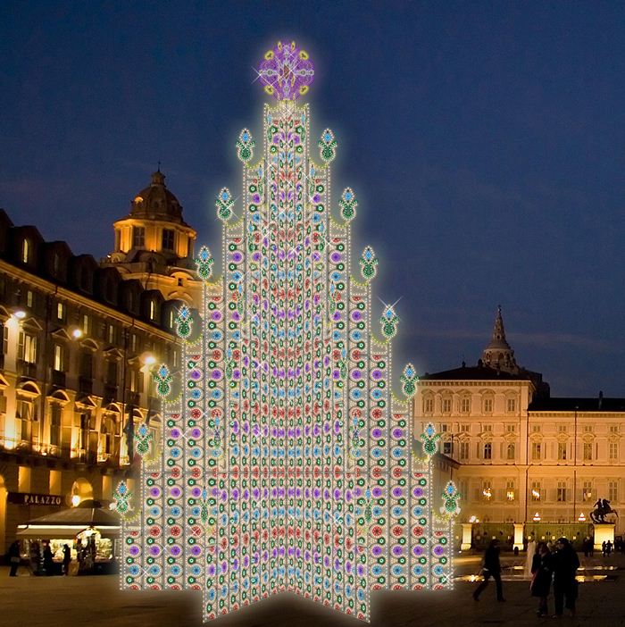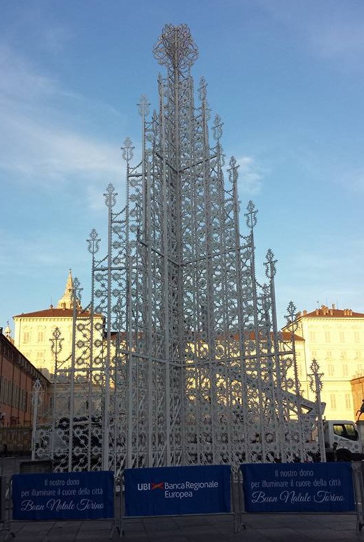 Martedì 1 dicembre si inaugura il calendario di A Torino un Natale coi fiocchi, un mese di eventi, spettacoli e animazione in vista del Natale. Piazza Castello ospita il nuovo Albero e il Calendario dell’Avvento. Il nuovo Albero natalizio, alto 18,60 metri, ha un diametro di 12.20 m e una forma piramidale con 5 facce autoportanti ed è composto da 223 elementi aggregati da un telaio in legno verniciato di colore bianco. L’illuminazione è creata da 43mila lampadine led colorate comandabili per essere accese singolarmente e da 25mila microled per gli effetti speciali. L’albero è stato realizzato grazie al sostegno di Banca Regionale Europea del Gruppo UBI Banca