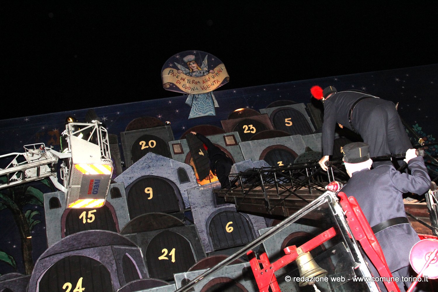 Il Calendario dell’Avvento è quello già utilizzato in passato sui bozzetti di Emanuele Luzzati. Ogni giorno, alle ore 18, i Vigili del Fuoco del Comando Provinciale di Torino, con i loro mezzi scoprono una nuova casella. La cerimonia è diventata ormai una rituale consuetudine per vivere insieme l’attesa e l’entusiasmo della sorpresa.