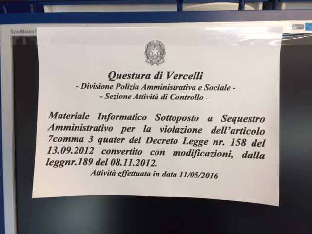 Nell’ambito di servizi mirati al contrasto del gioco d’azzardo e a tutela dei minori, la polizia ha fatto dei controlli in un esercizio pubblico di vercelli, in zona Porta Torino. Il titolare è stato sanzionato con 7000 euro di multa gli sono state sequestrate quattro macchinette slot machine che erano in grado di colegarsi ad internet.