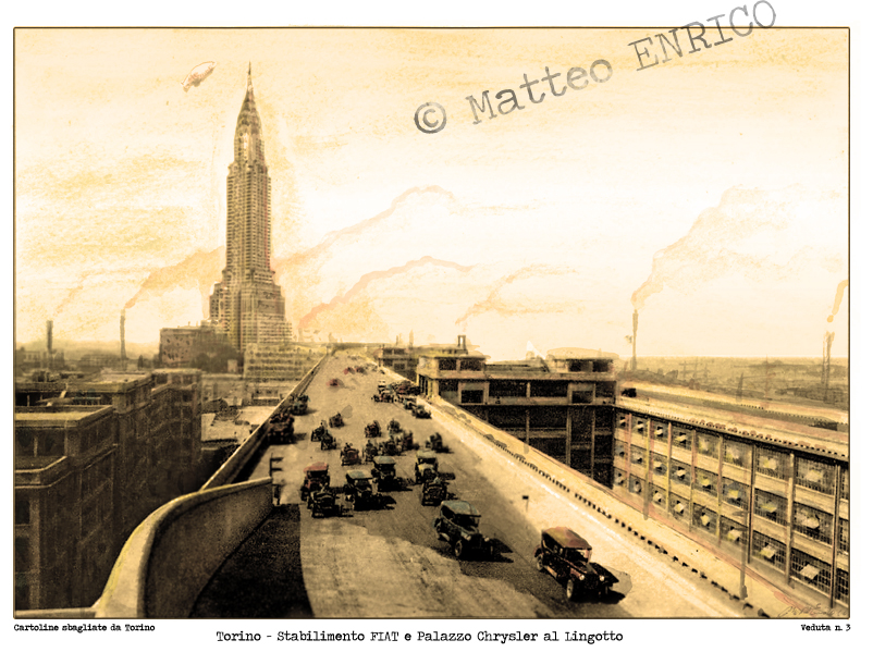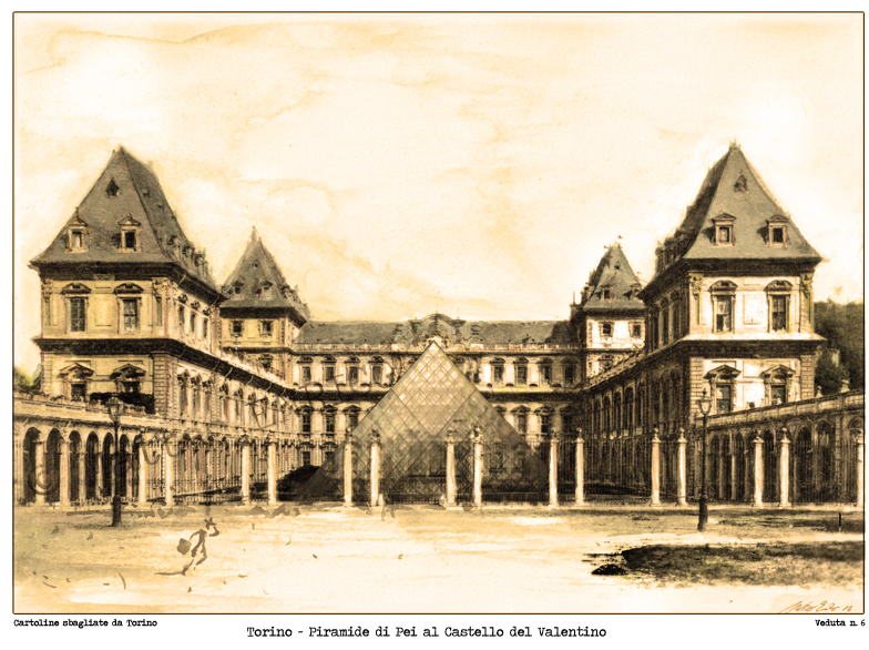 Il disegnatore della Torino fashion House ha realizzato 8 vedute impossibili del capoluogo mischiando piazze torinesi con monumenti di altre città o inserendo monumenti torinesi in luoghi alieni. Il tutto realizzato in un color seppia che rende perfettamente l’idea della cartolina antica… però completamente sbagliata.