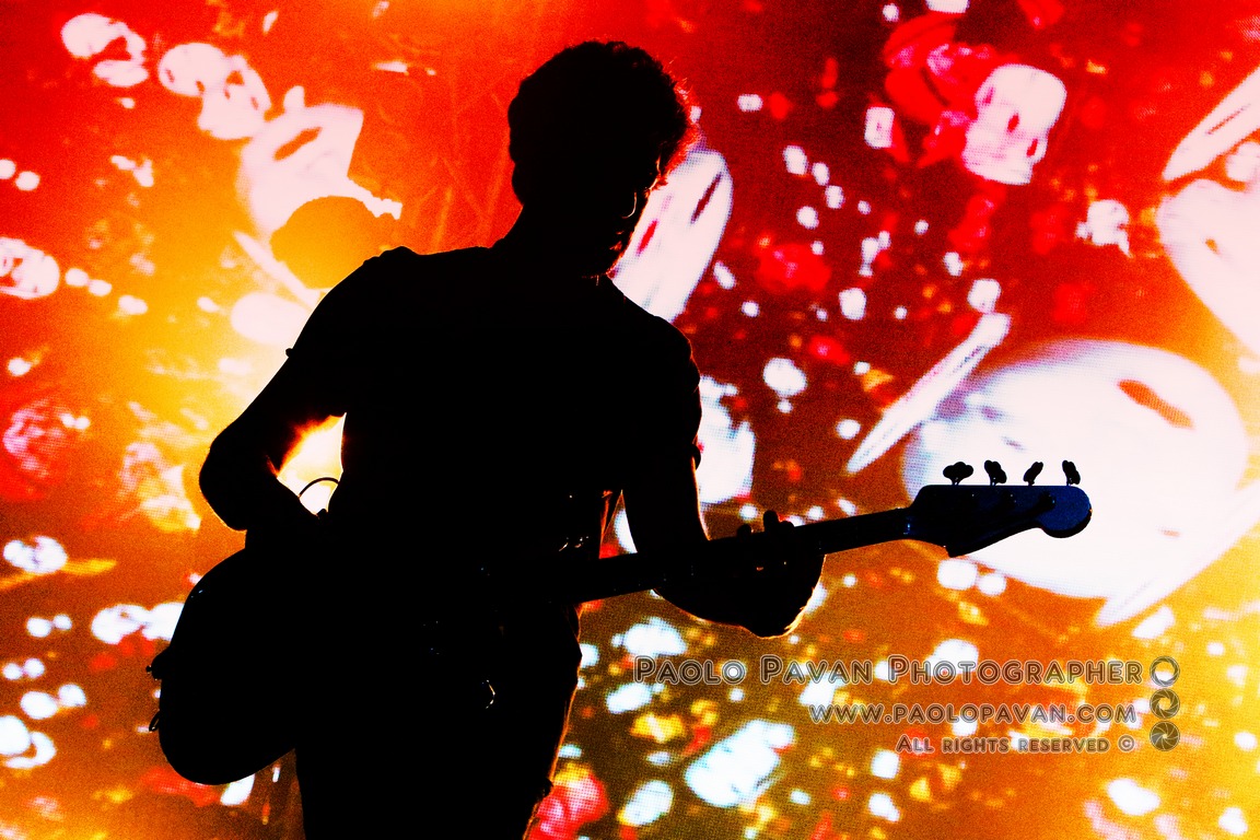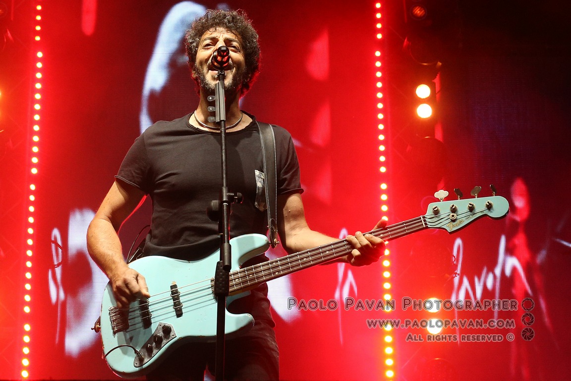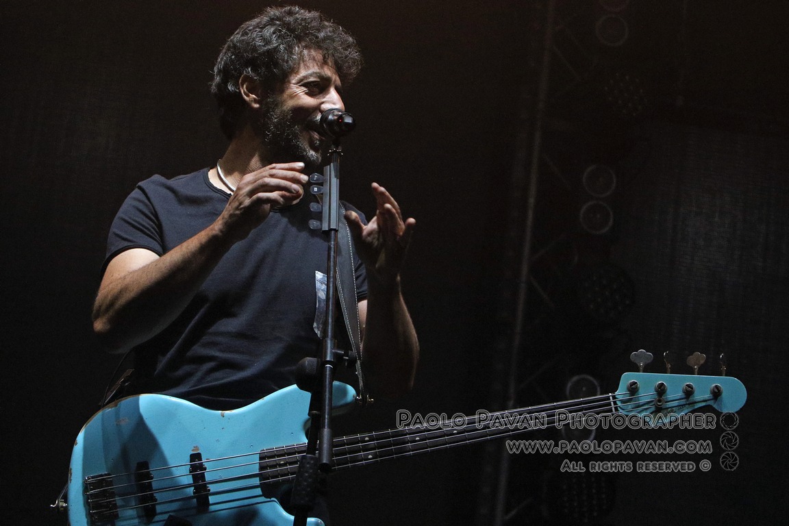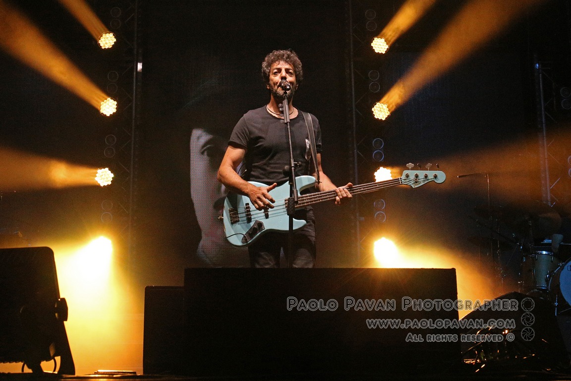 Sale sul palco con po’ di ritardo, ma l’attesa sarà premiata, 23 brani per più di due di concerto, un lungo viaggio nella sua discografia, che conta ben dodici album. Compare su una pedana, con il suo fido basso Fender Jazz, circondato da due torri di luci, per un inizio di sicuro impatto, anche perché parte subito con la “Favola di Adamo ed Eva”, sua superhit amatissima che scatena il pubblico.