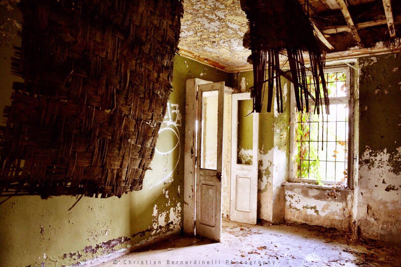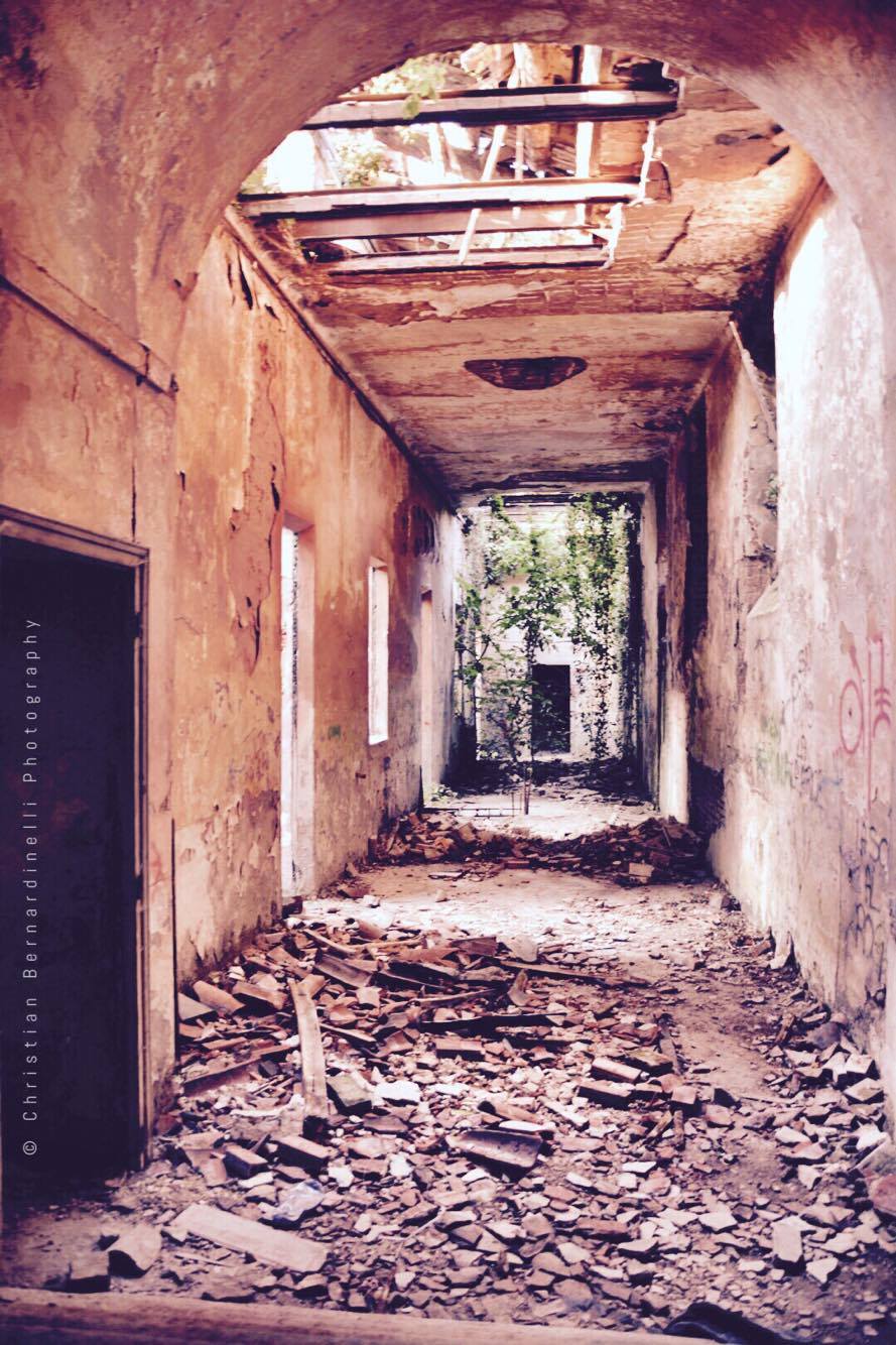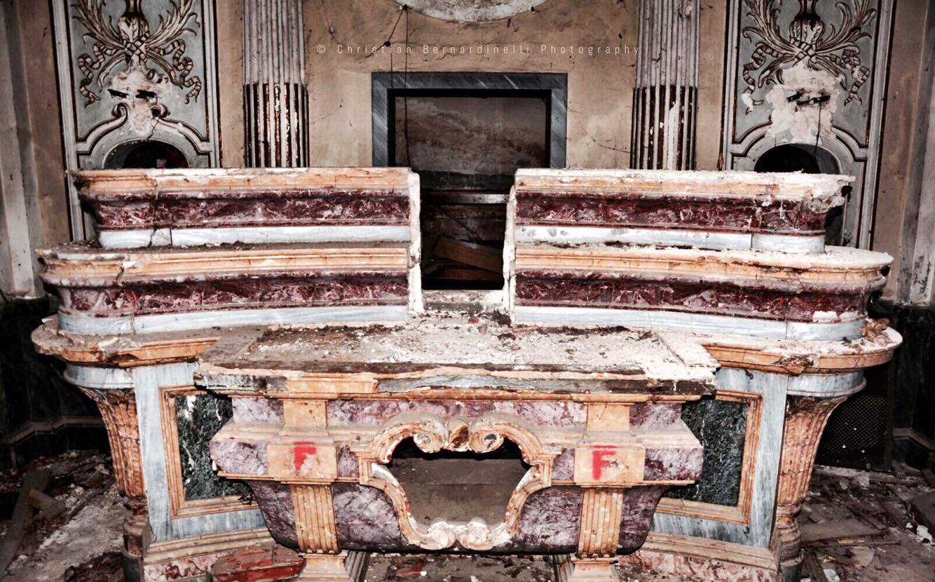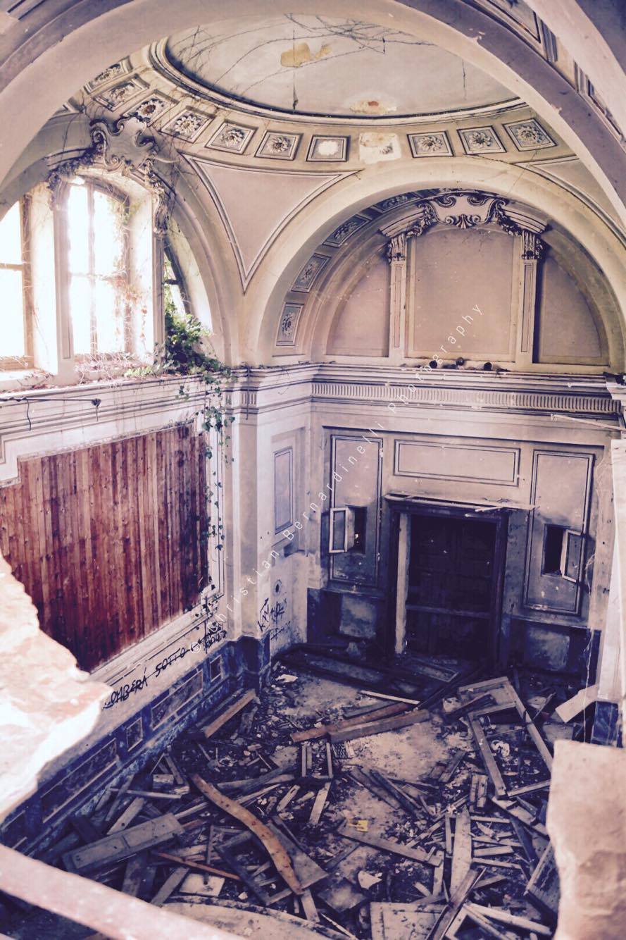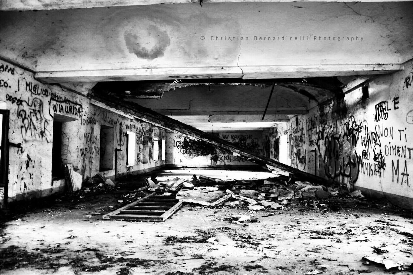 Oggi è una distesa di macerie, le stanze mostrano i segni dell’antico splendore ma dentro, come mostrano le foto di Christian Bernardinelli, c’è solo devastazione.