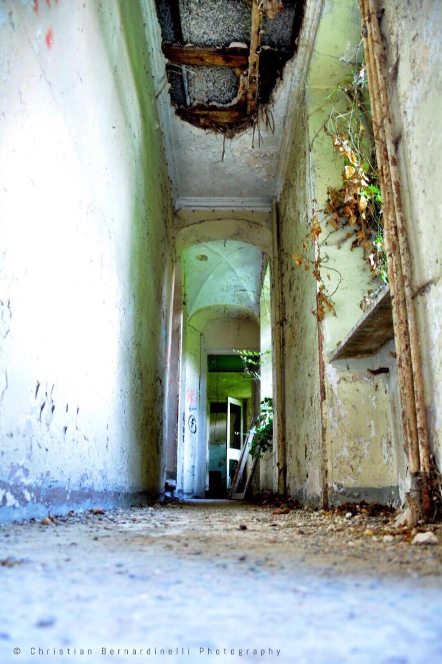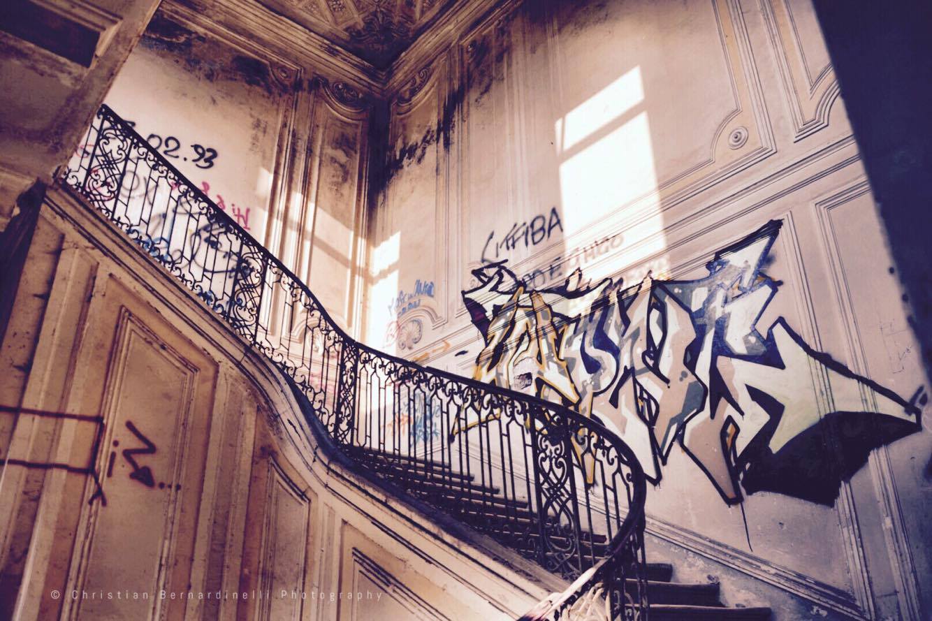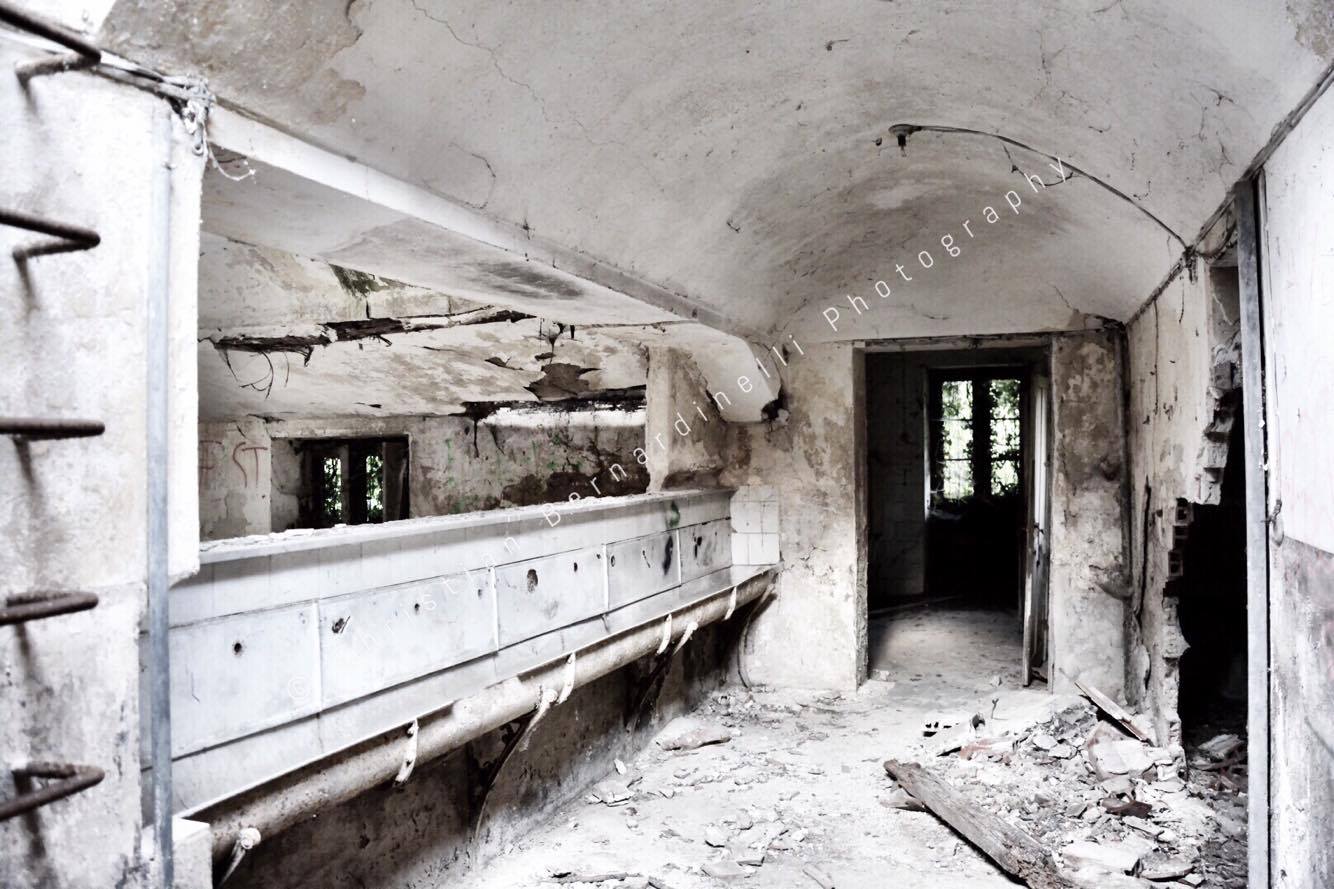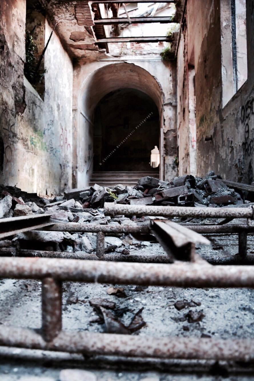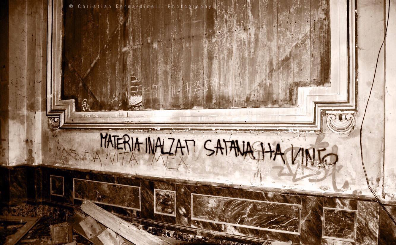 Oggi è una distesa di macerie, le stanze mostrano i segni dell’antico splendore ma dentro, come mostrano le foto di Christian Bernardinelli, c’è solo devastazione.