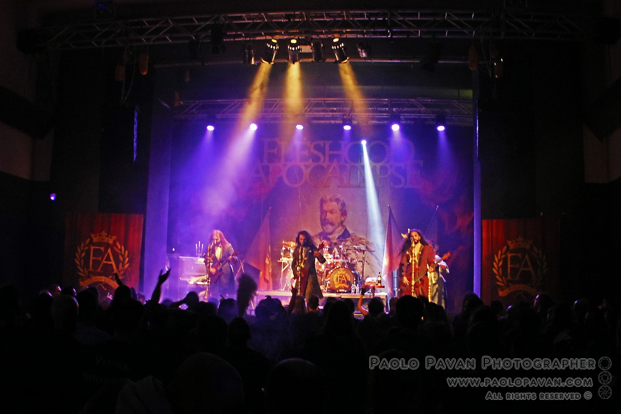 Apocalisse sonora, ieri sera, al Cap 10100 dove continuano le serata promosse da Radar Associazione Culturale, con i perugini Fleshgod Apocalypse, noti alfieri del death metal nostrano. Serata per gli amanti del genere, dell’headbanging e dei suoni estremi, con un opening act ad opera dei Scream 3 Days. La band, molto attesa, non ha deluso, forte impatto scenico, grande qualità tecnica dei componenti, Tommaso Riccardi (voce, chitarra), Cristiano Trionfera (chitarra, cori), Paolo Rossi (basso, voce), Francesco Ferrini (pianoforte) e Francesco Paoli (batteria, voce e chitarra).