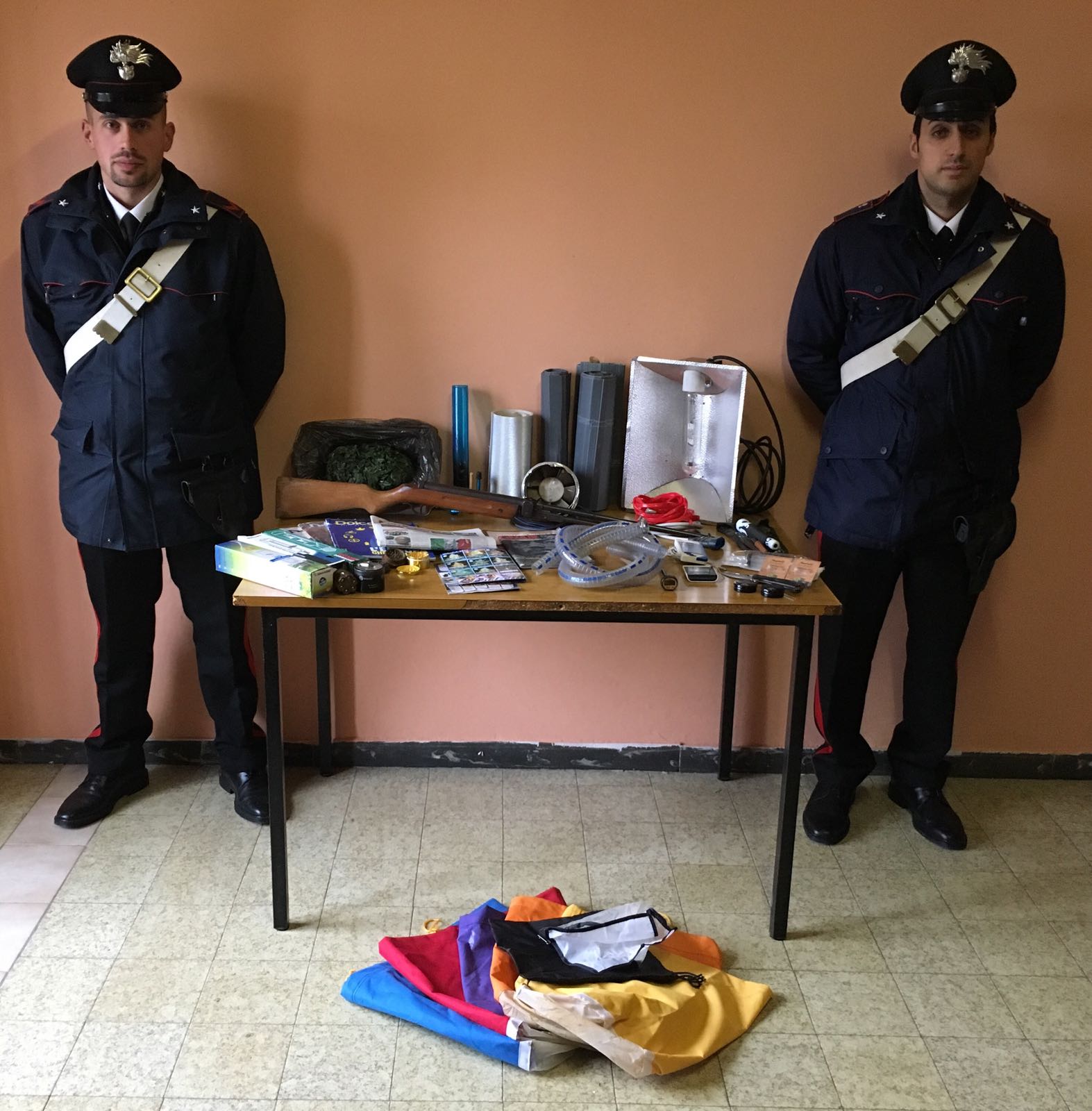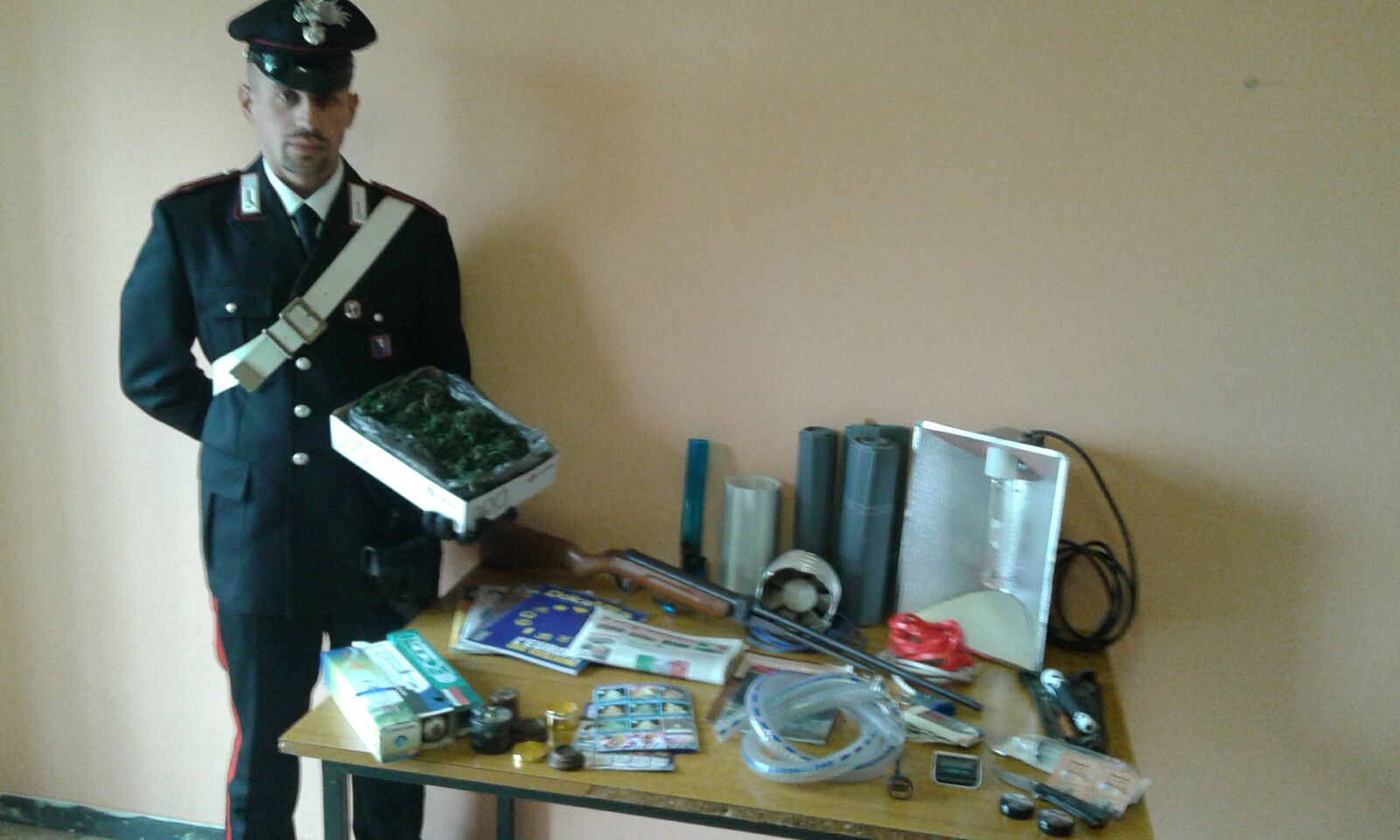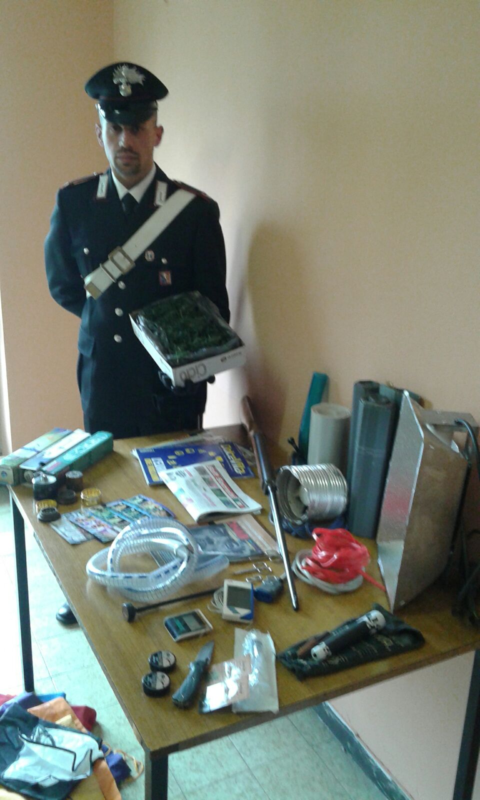 In una scatola, inoltre, sono stati rinvenuti altri 4,5 grammi di sostanza stupefacente del tipo hashish. Sempre nascosto in casa e nelle sue pertinanze sono stati rinvenuti numerosi oggetti utili alla produzione di di marijuana, essicatoi, lampade, semi, manuali d’istruzione per la coltivazione ed altro materiale ancora.