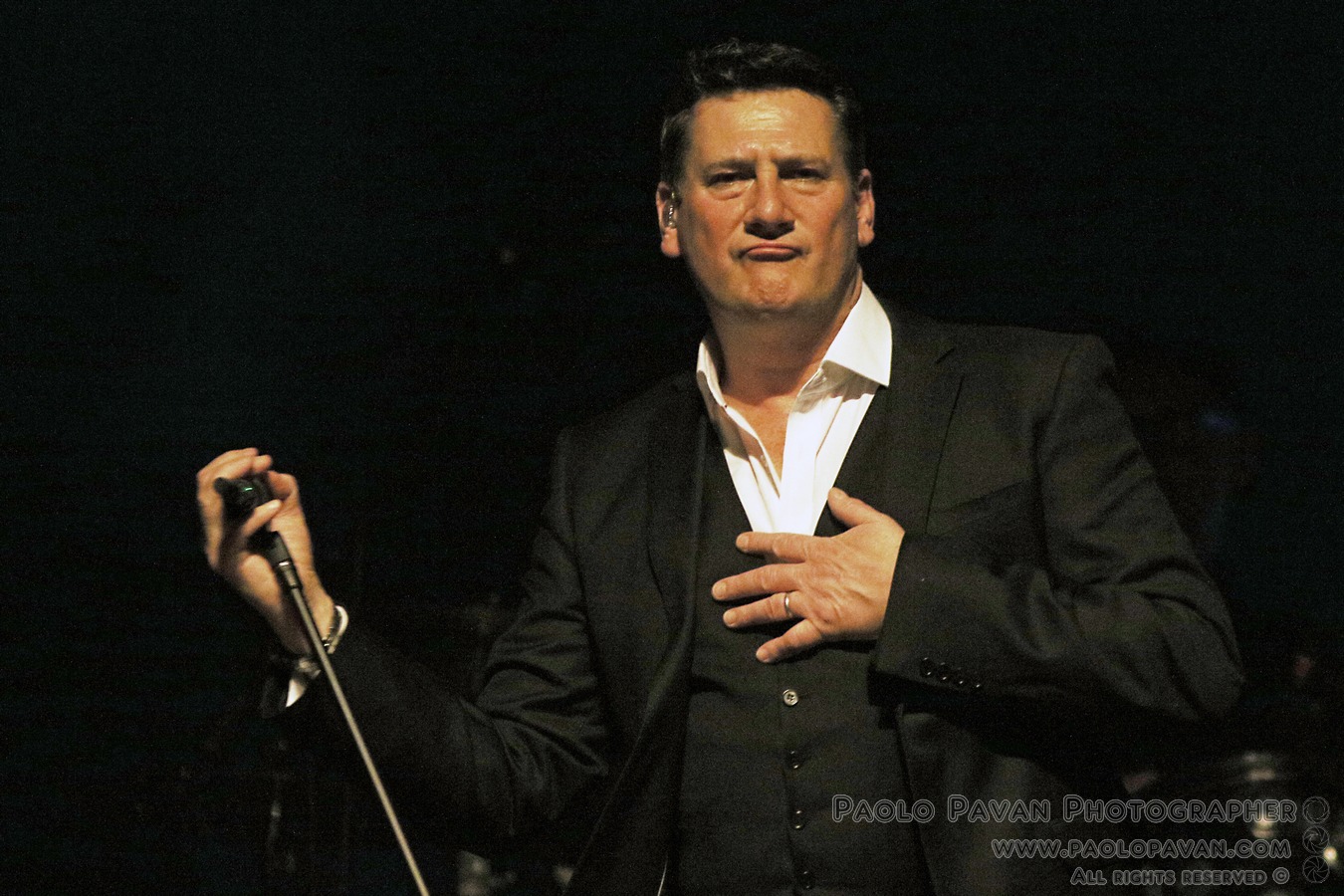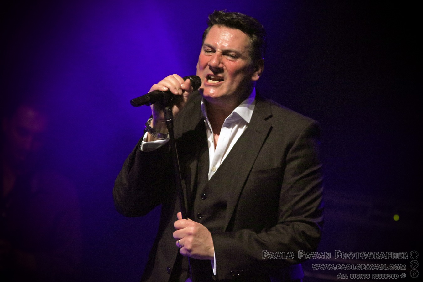 Puntualissimo spacca subito la serata con un omaggio da brividi a David Bowie, con una bellissima versione di “Life on mars” a cui segue il ritmo di “To Cut A Long Story Short” ed è davvero difficile stare fermi sulle poltrone. Sembra di essere ad un concerto degli Spandau, pure più energico tanta è la forza della band, lo si vede nel riff di “Highly Strong”. Solo ora la serata entra nella sua prima dimensione natalizia, dove Tony esalta le sue doti da crooner (credo pochi abbiano la sua classe anche in questo campo), con due hit natalizie, “Santa Claus is coming to town” nella versione di Bruce Springsteen e “Let it snow”, che precedono “Round and round” e la storica “I’ll fly for you”. Ancora il natale con la già citata e magica “Fairy tale of new york” e “Driving home for Xmas” di Chris Rea, che sono il preludio al momento centrale del concerto, in cui l’anima pop rock e da show man di Tony prende il sopravvento. “Soul Boy” e “Only when you leave”, altro grande successo con la band, precede forse il momento più intenso della serata con uno strepitoso tris di megasuccessi, “With or without you” degli U2, “Somebody to love” dei Queen, omaggio a Freddy Mercury davvero riuscito ed in mezzo l’intramontabile ed immancabile “Through the barricades”. C’è spazio ancora per “Lifeline” e non solo, prima dei bis finali, che vedono il pubblico andare sotto il palco. “True”, eseguita con un’energia impagabile, tra un bicchiere di Jack Daniels e uno di vodka, ancora una spruzzata di Natale “Have yourself a merry little Xmas” e la divertentissima “Shake up Xmas”, prima di “Gold” super successo targato Spandau e gli auguri finali sulle note della classicissima “White Xmas”.