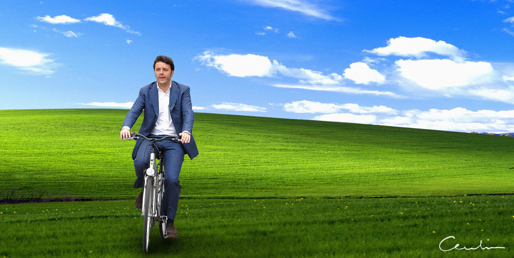 In Italia il premier Matteo Renzi gira il mondo in bicicletta dal 2014, anno in cui Andrea l’ha fatto pedalare sul prato del famosissimo sfondo desktop di Windows Xp. Renzi inseguito dai Power Rangers, attraverso uno Star Gate, a fianco di Harry Potter, giorno dopo giorno il blog In bici con Renzi diventa il primo vero ed autentico meme sul giovane Primo Ministro.