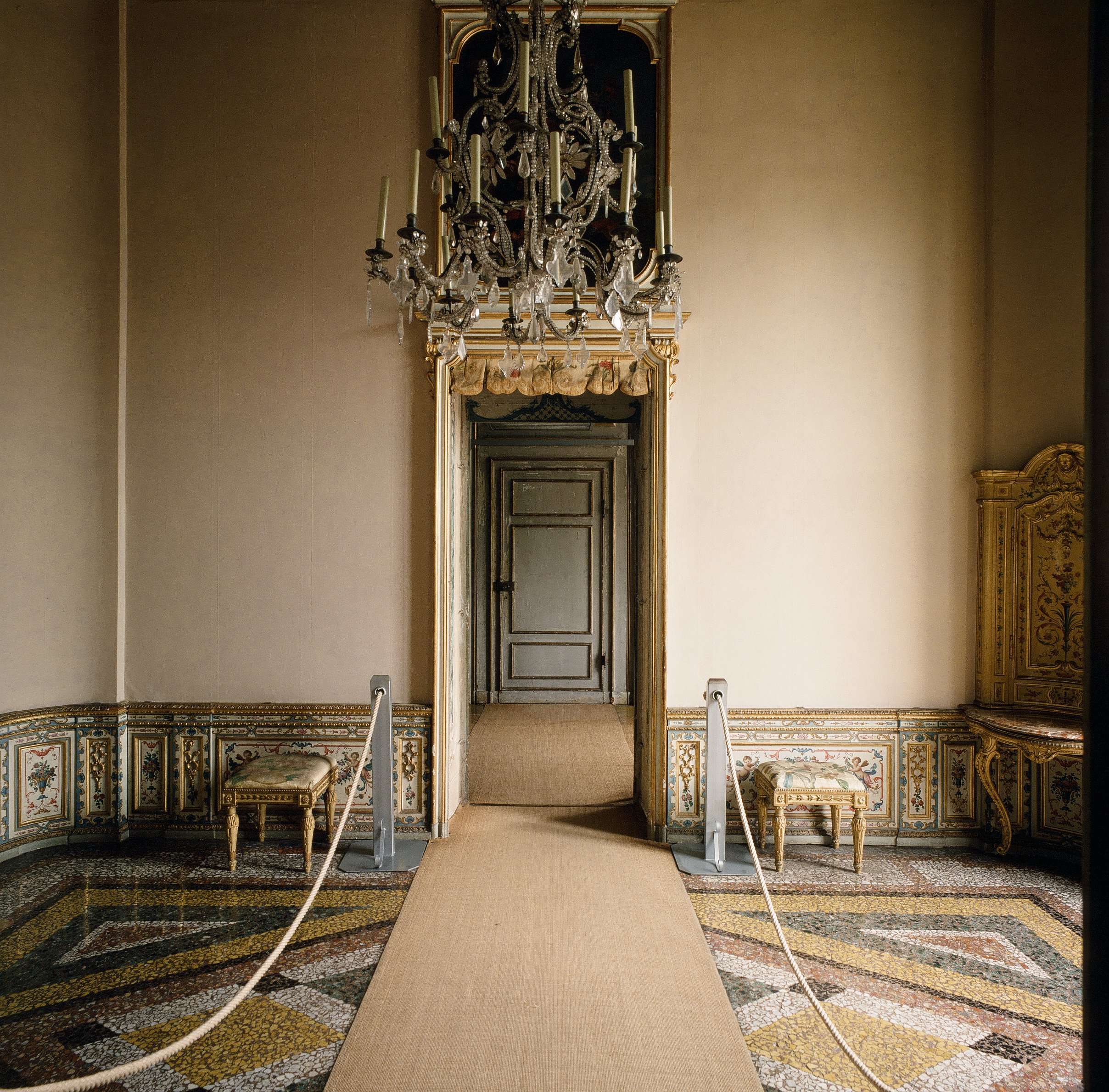 Nel Gabinetto da toeletta del Re i restauri interesseranno soprattutto la volta a grottesche con motivi ornamentali vegetali (“candelabre”), figure cinesi, putti policromi del Fariano, nonché le preziose angoliere di Francesco Maria Servozelli del 1757. Si lavorerà anche nel piccolo andito dotato di servizio igienico all’inglese con boiserie risalente al periodo della Regina Margherita.