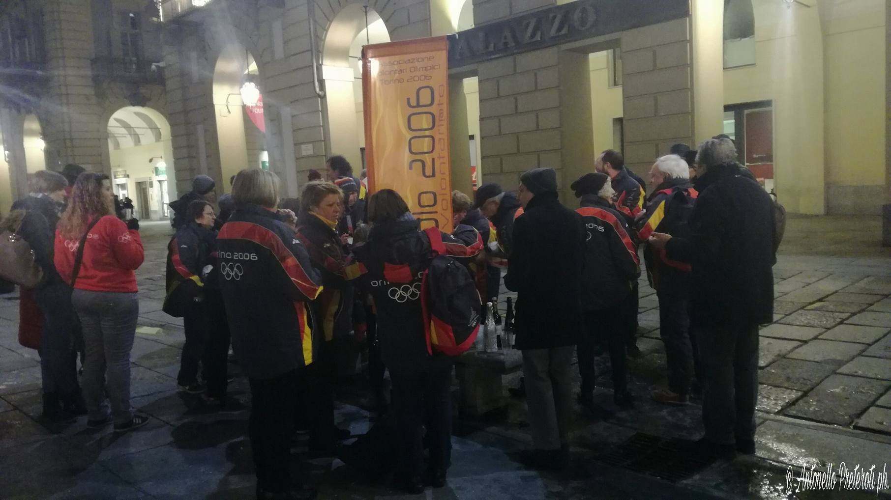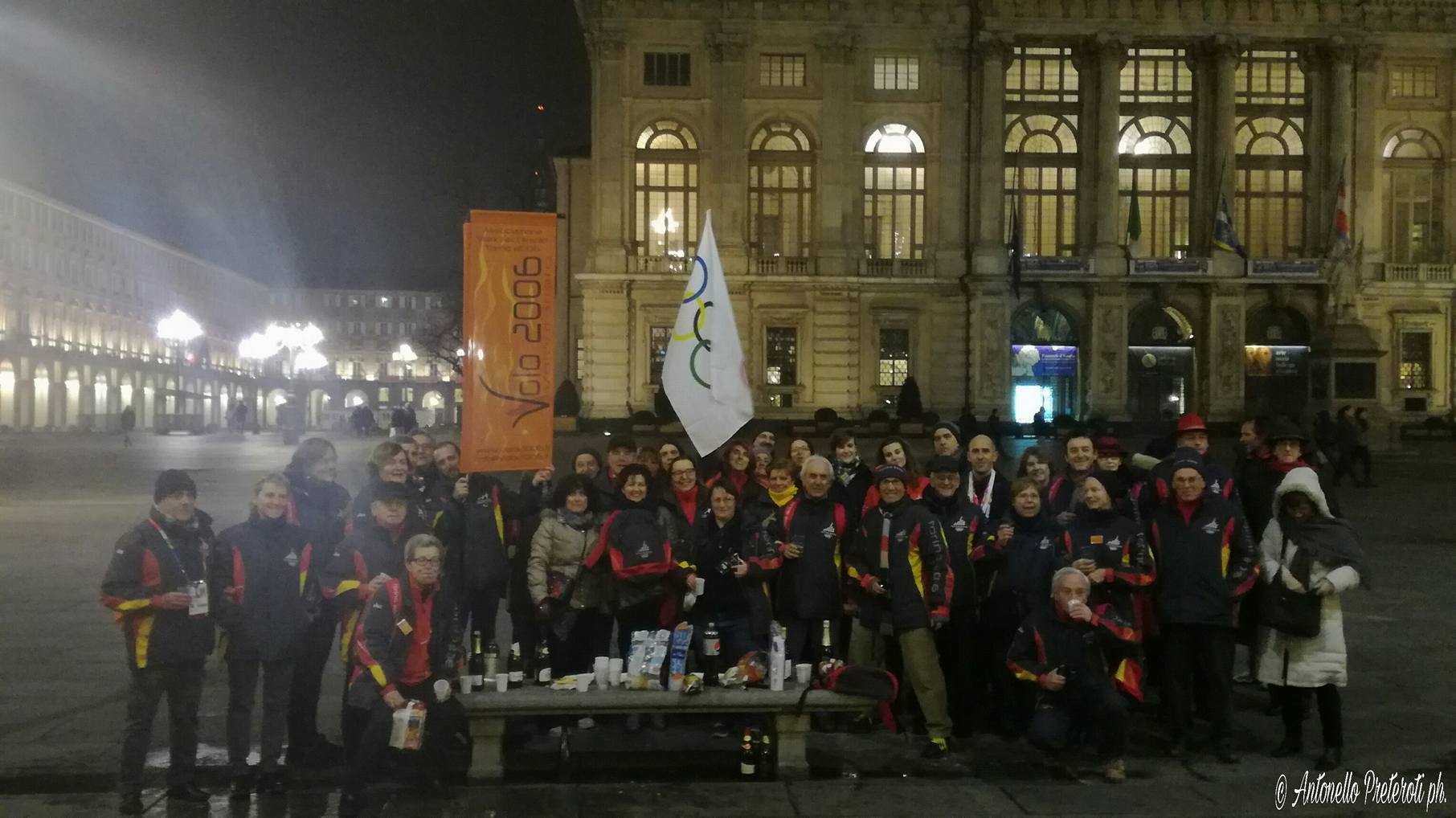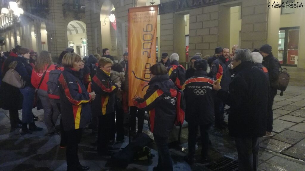 Flashmob in Piazza Castello a Torino, di fronte al Palazzo della Regione, per un gruppo e dell’Associazione Volontari Olimpici 2006 che si è dato appuntamento per brindare tutti per l’undicesimo anniversario dai XX Giochi Olimpici Invernali di Torino 2006 e ricordare momenti trascorsi insieme durante quei giorni.