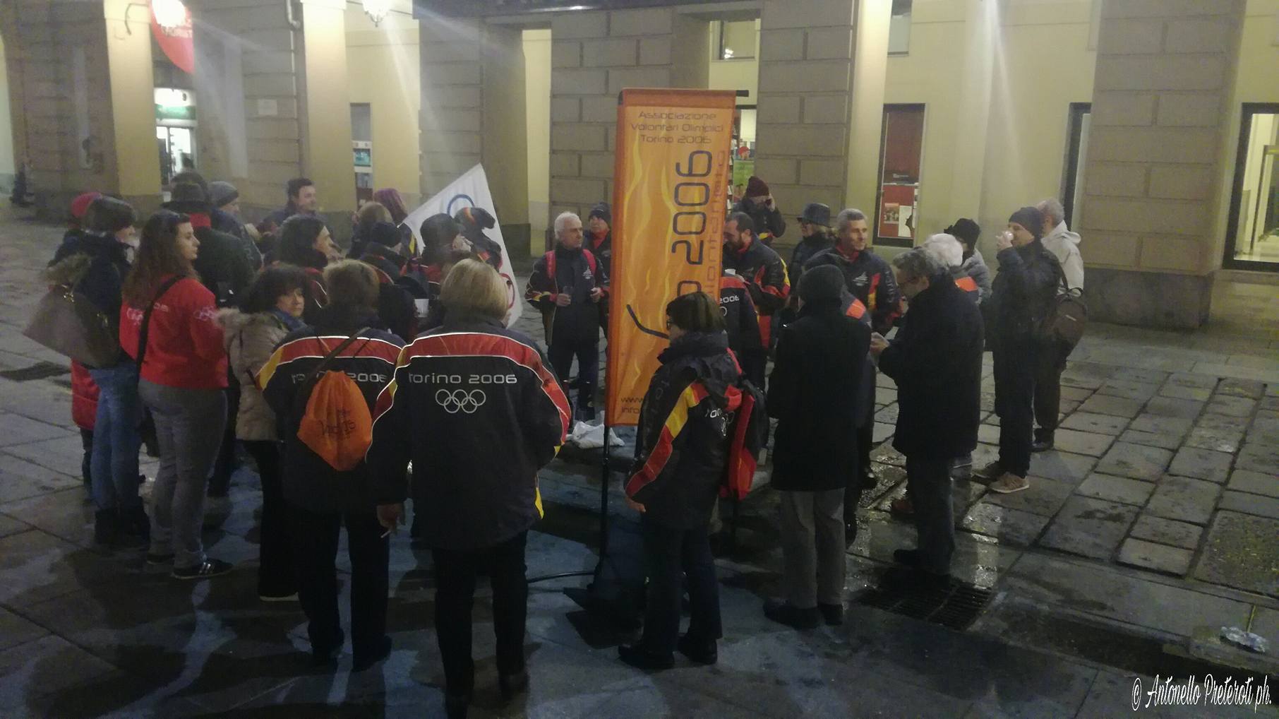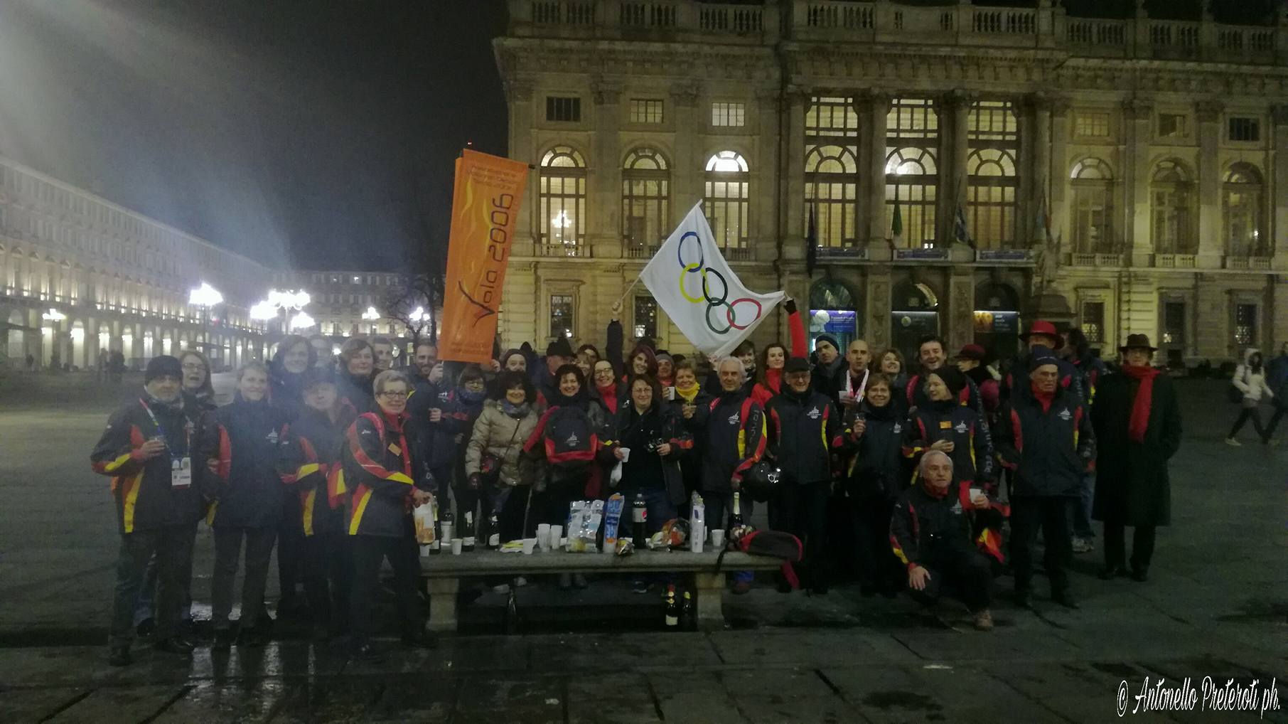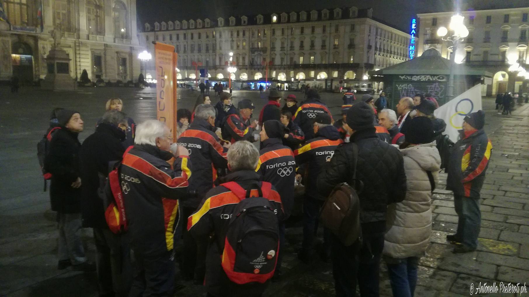 Flashmob in Piazza Castello a Torino, di fronte al Palazzo della Regione, per un gruppo e dell’Associazione Volontari Olimpici 2006 che si è dato appuntamento per brindare tutti per l’undicesimo anniversario dai XX Giochi Olimpici Invernali di Torino 2006 e ricordare momenti trascorsi insieme durante quei giorni.