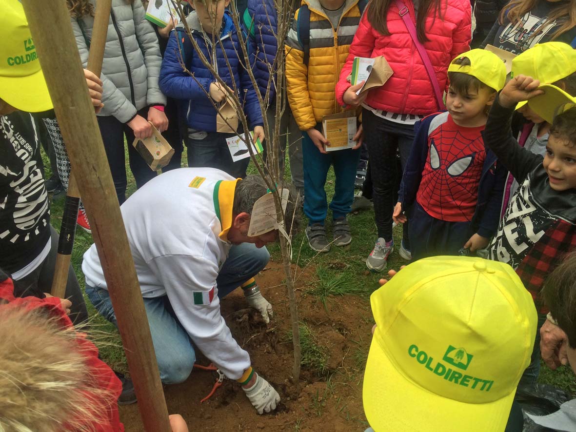 In totale un centinaio di ragazzi, che con gli insegnanti e i tecnici di Coldiretti hanno messo a dimora alberelli di melograno, ciliegio, cachi-melo e acero.