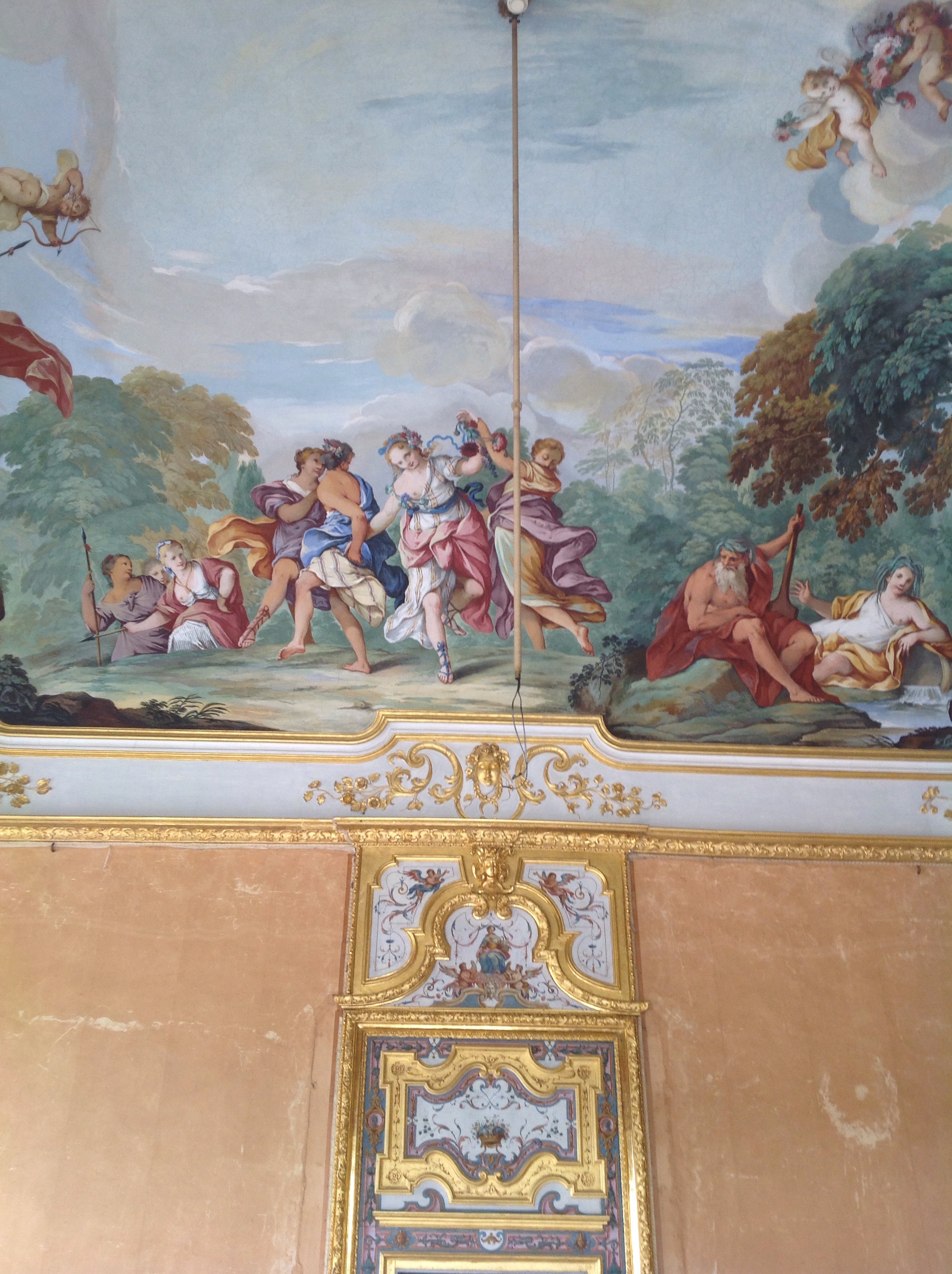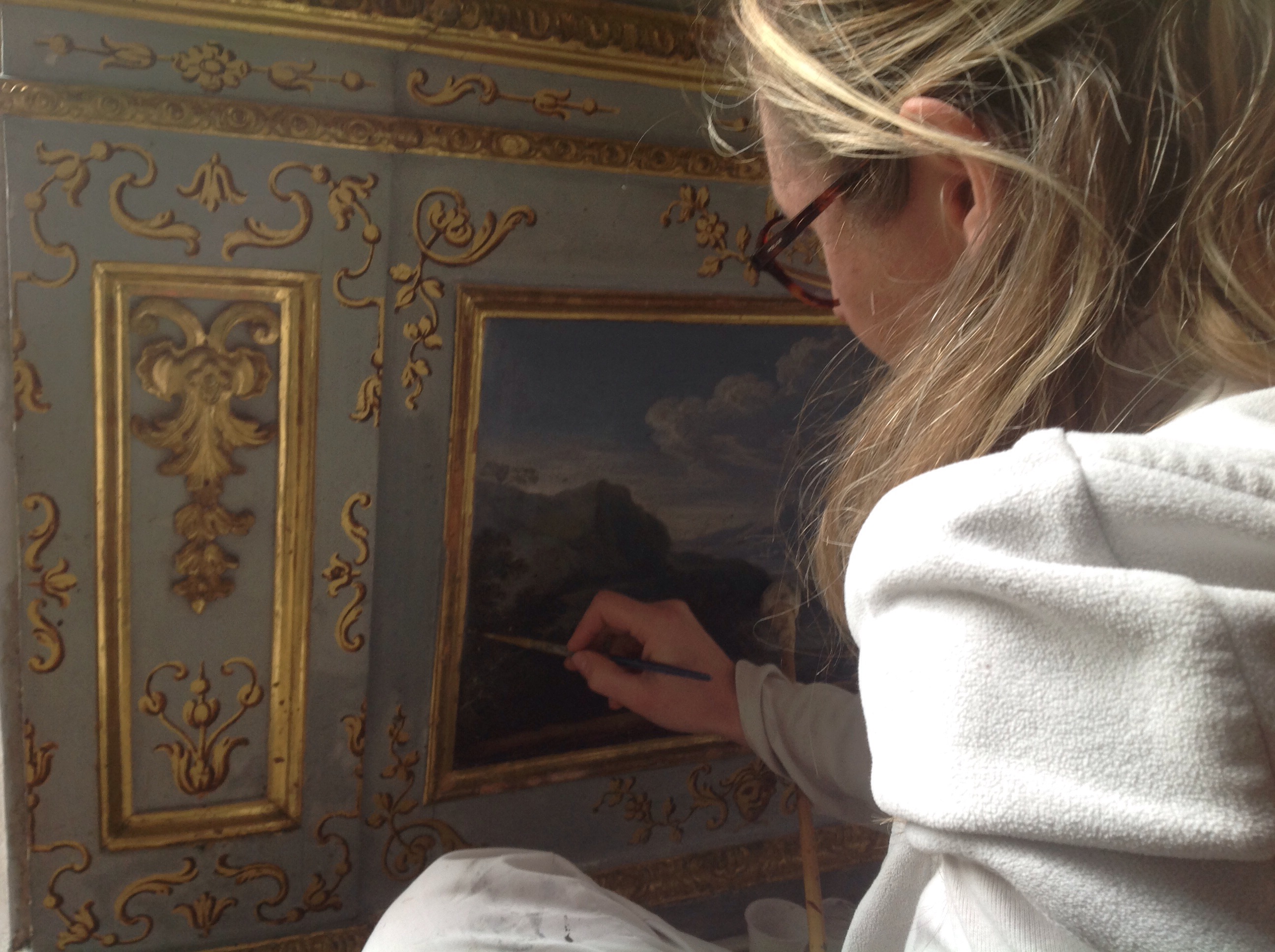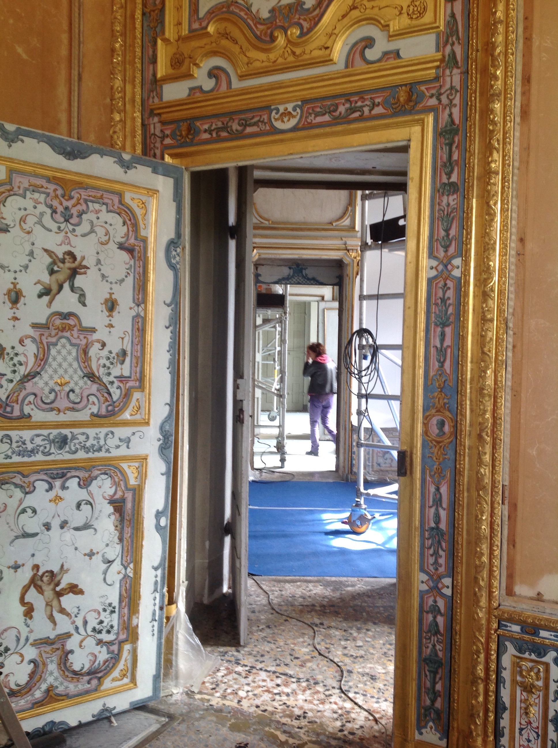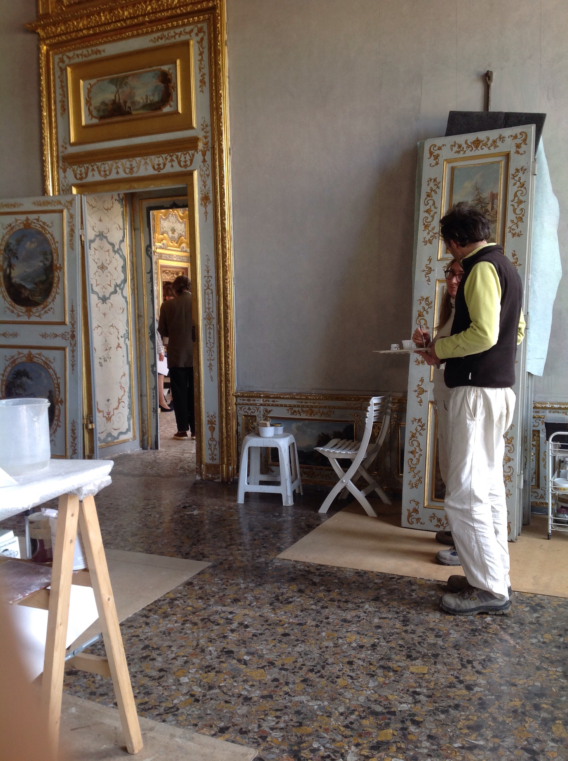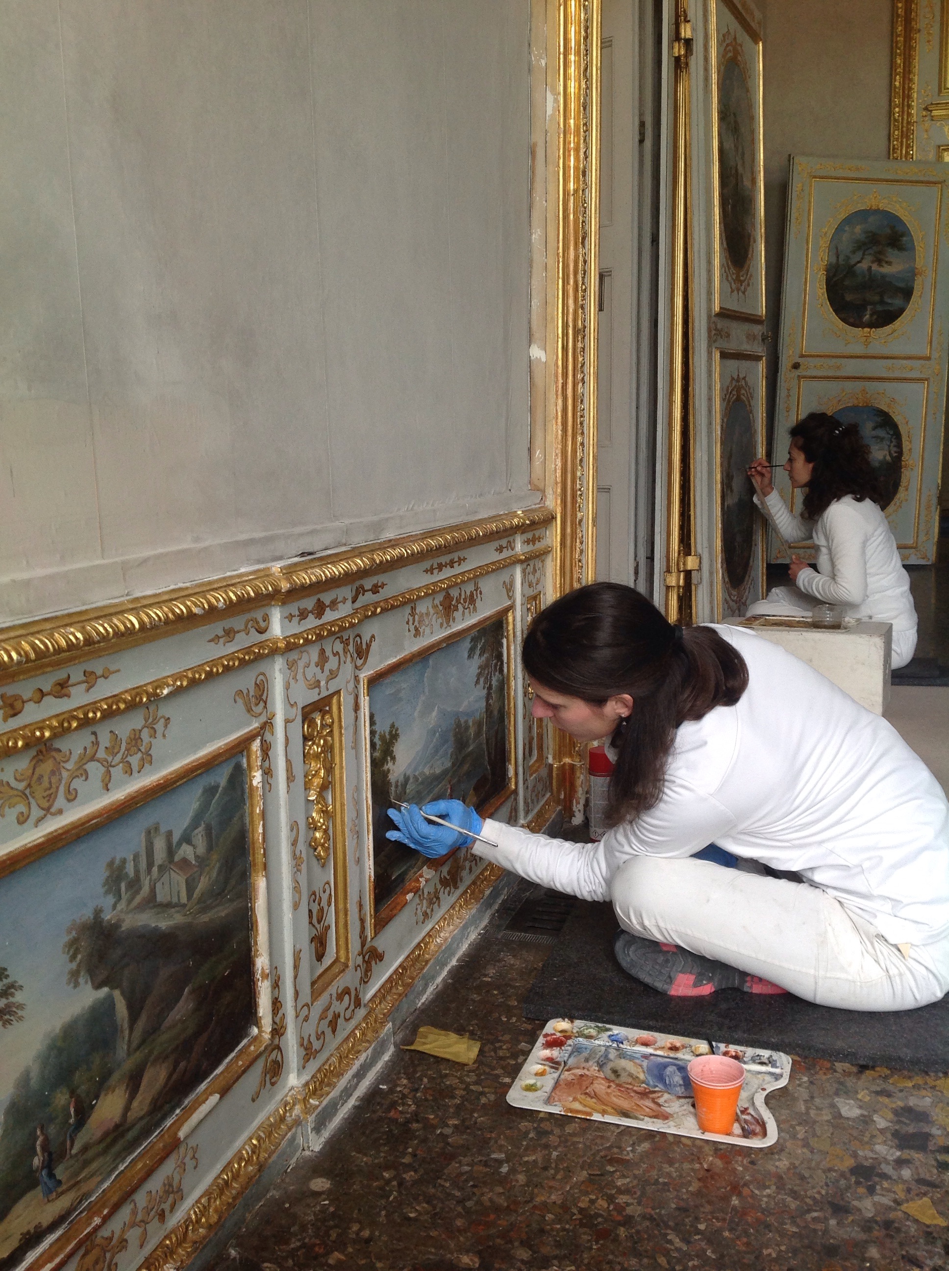 Sono in corso gli interventi di restauro su tutta la boiserie dell’Appartamento, in gran parte di fattura settecentesca, che presentava in particolare sulle porte gravi problemi conservativi con sollevamenti importanti. Si è proceduto alla pulitura e al consolidamento delle superfici in legno dipinto e dorato, che ha riportato cromie e dorature all’antico fulgore, mentre ci si appresta all’esecuzione di piccole stuccature e integrazioni cromatiche della foglia d’oro. Sono inoltre in restauro in laboratorio tutti i dipinti su tela delle sovrapporte: le opere di Domenico Olivero dell’Anticamera e quelle della Galleria e del Gabinetto da toeletta.