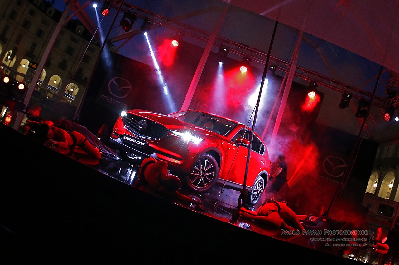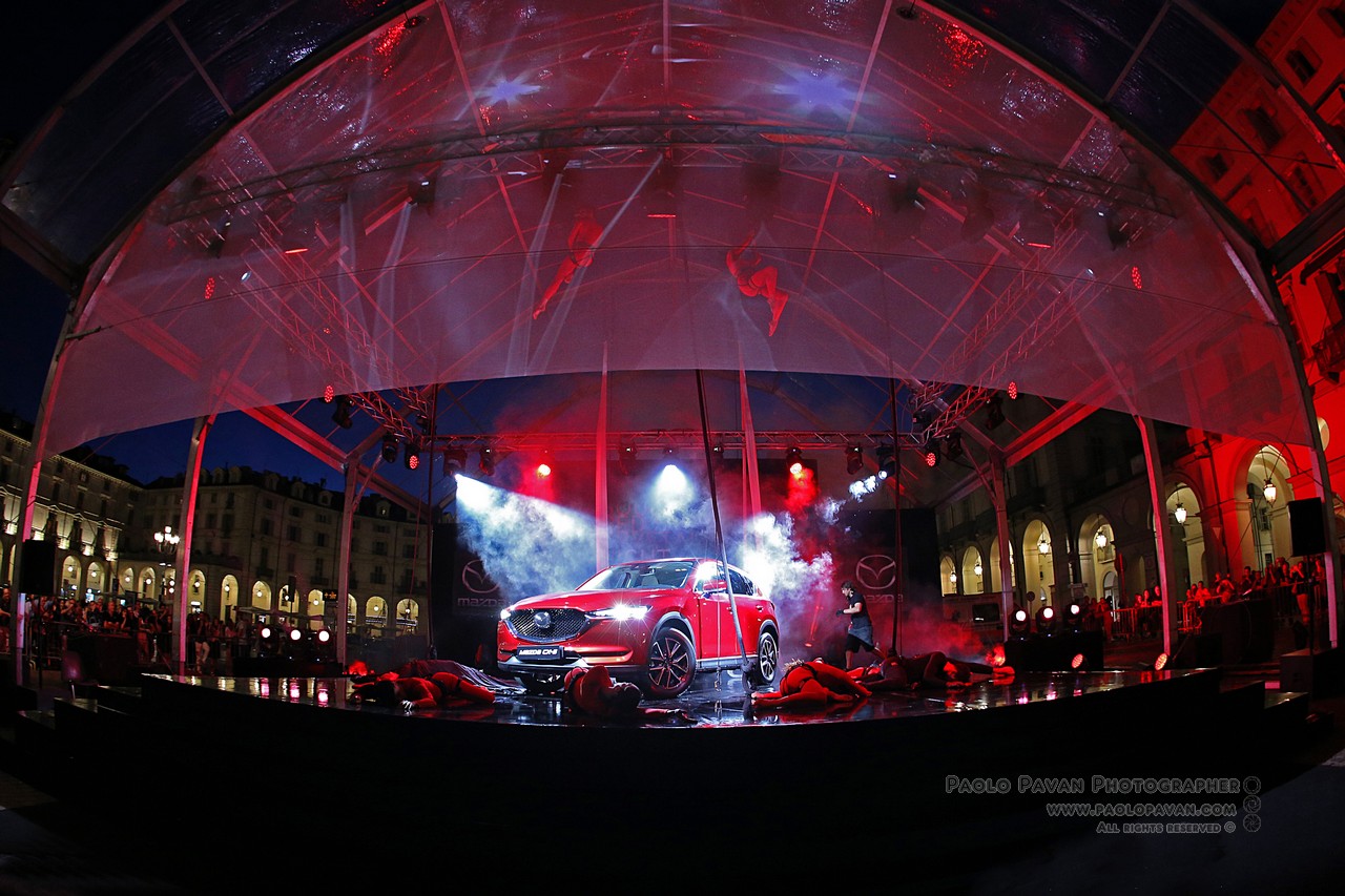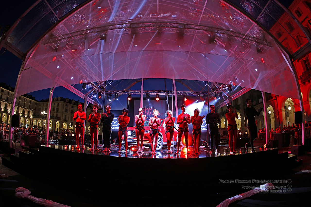 Grande evento a cornice delle manifestazioni per il Salone dell’Auto di Torino 2017, in Piazza Vittorio per la Soul Red Crystal Night, dove è stata presentata in anteprima nazionale la nuova Mazda CX-5 ed il rosso più bello del mondo. Uno spettacolo targato Fura del Baus, celebre compagna di danza e teatro, famosa in tutto il mondo. Dieci minuti di voli ed acrobazie nel cielo di Torino, sotto un manto rosso, esattamente come la nuova Mazda CX-5.