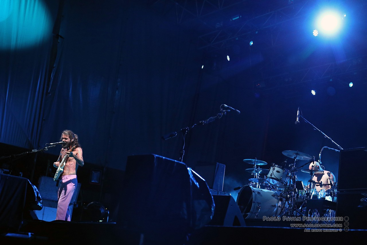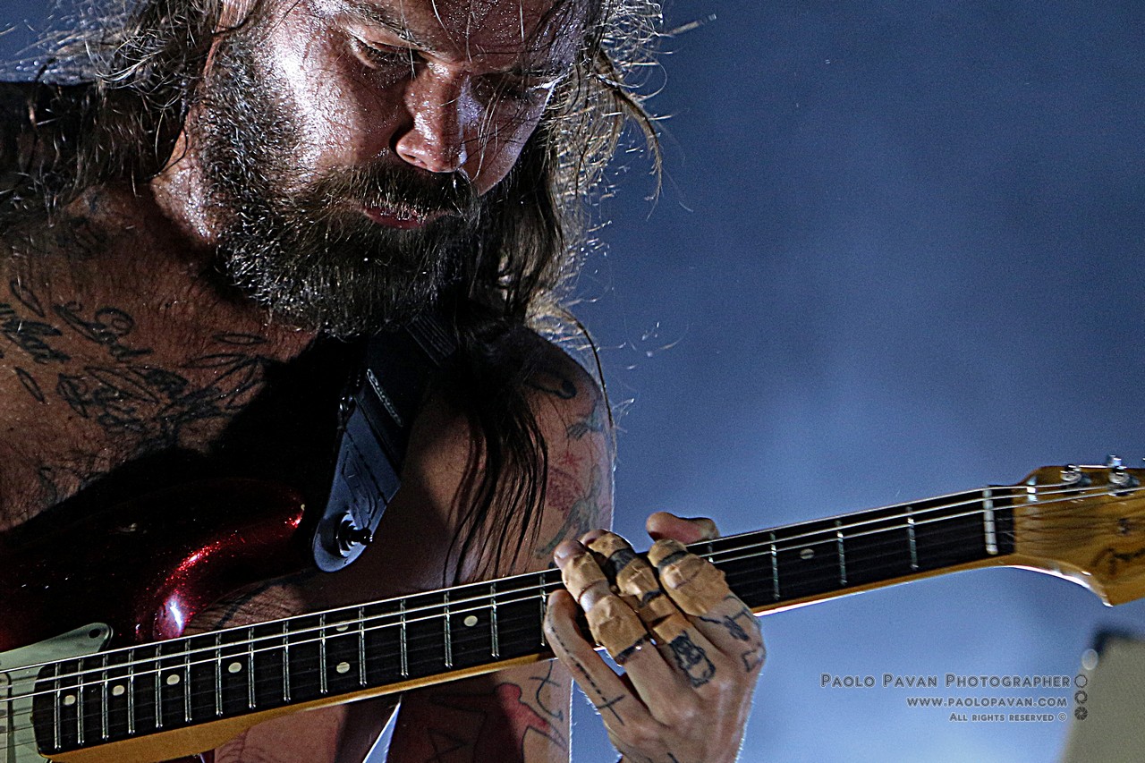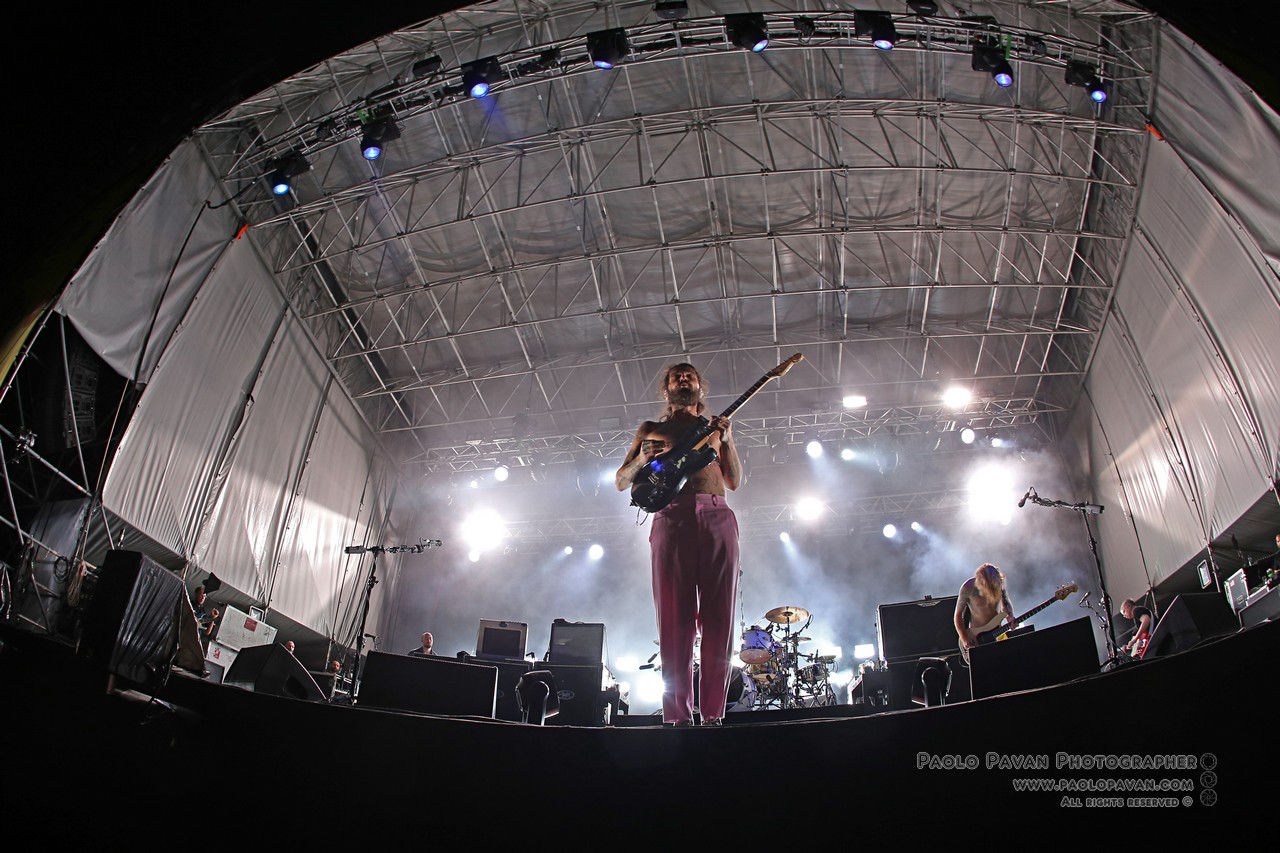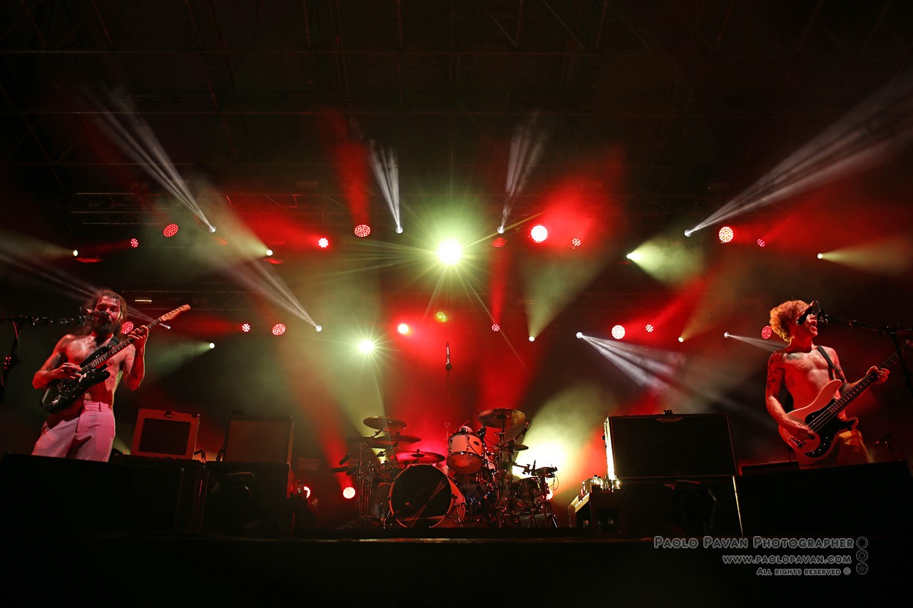 Capitanata dall’istrionico Simon Neil, affiancato dai fratelli Johnston, James al basso e Ben alla batteria. Rigorosamente a torso nudo, con Simon ricoperto ovunque da tatuaggi, non si fanno pregare, si fingono immobili ma partono subito con “Wolves Of Winter”, un concentrato di energia, chitarra e batteria all’ennesima potenza.