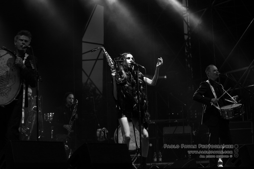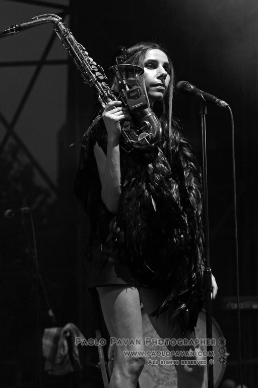 Puntuale alle 20.30 sale sul palco, lei, PJ Harvey, look inconfondibile e sax in mano. Una grande esibizione intima ed energica, con un crescendo costante lungo l’esibizione, grazie anche alla forza di una grande band di contorno.