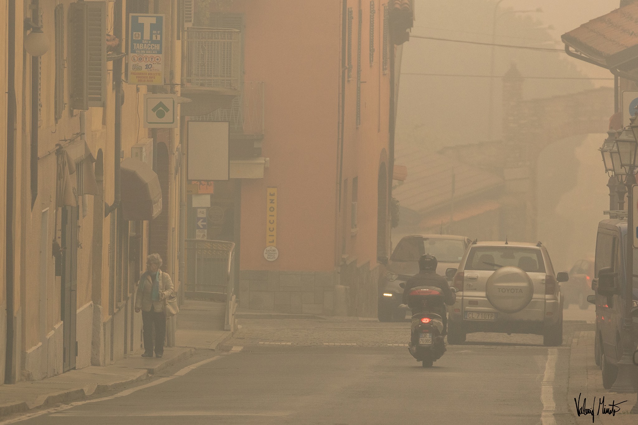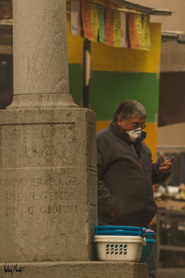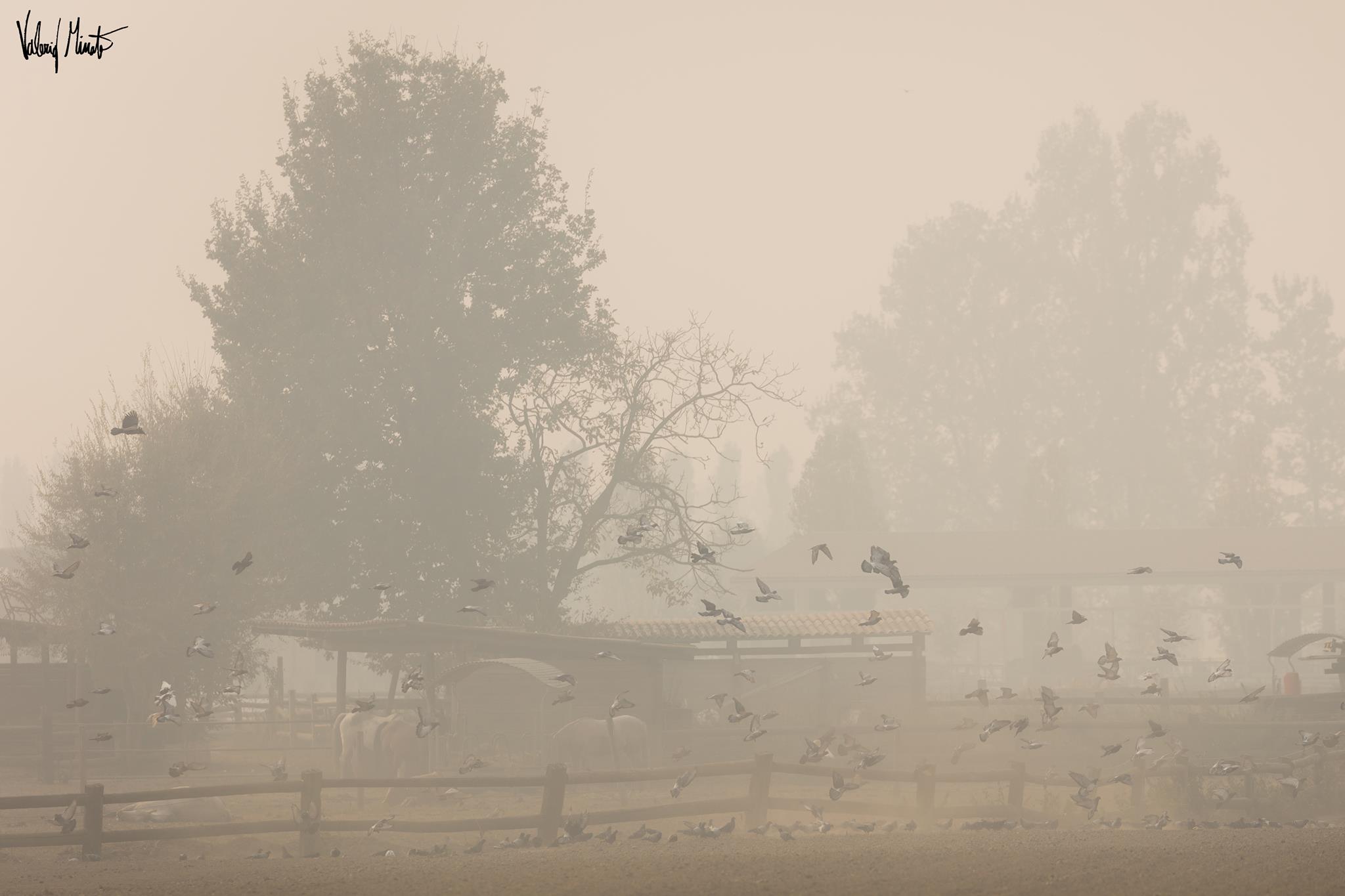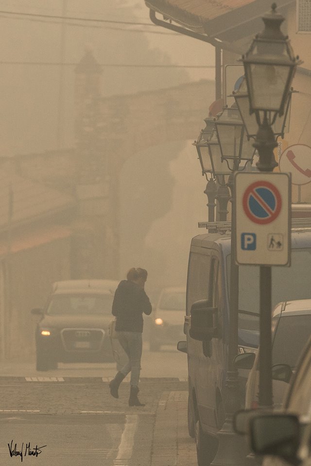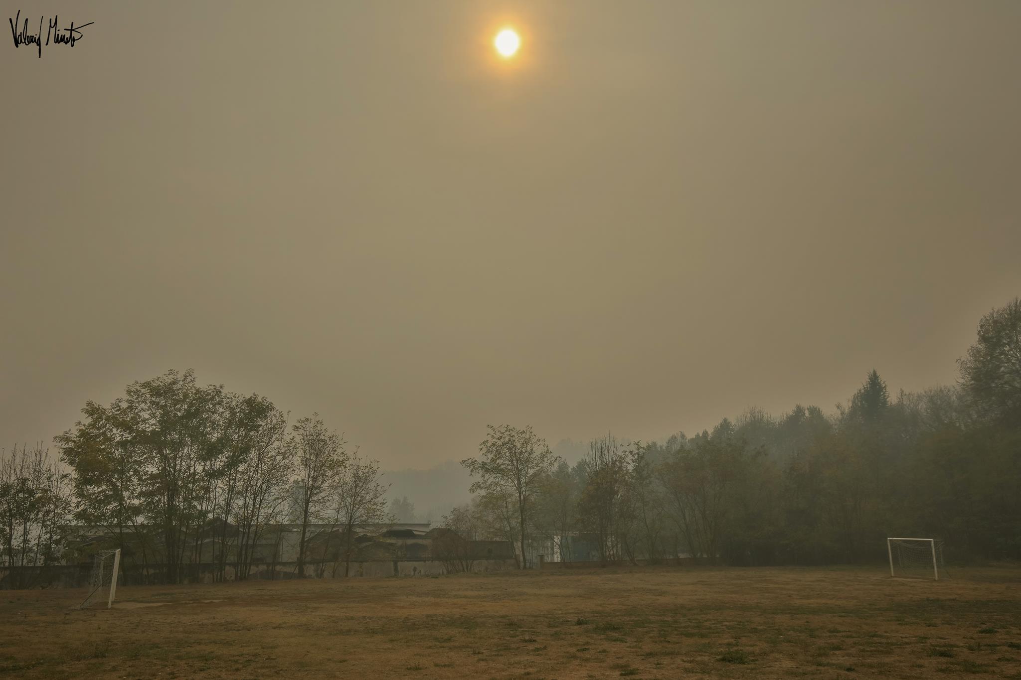 Il fumo avvolge tutto, la fuliggine si deposita ovunque, l’odore si impregna sulla pelle e sui vestiti, dopo un paio d’ore di scatti iniziavano a bruciare gli occhi. Passato Pinerolo sono salito verso Frossasco e Cantalupa. Non mi sono spinto fino agli incendi, non sono attrezzato, non volevo correre rischi inutili e oltretutto rischiare di intralciare le vetture dei Vigili del fuoco che continuano ad andare su e giù cercando di salvare il salvabile… il parco giochi di Cantalupa fuori dalla scuola elementare ovviamente deserto, i bambini che escono da scuola coprendosi alla bell’e meglio naso e bocca. Il sole spento sulle teste è l’emblema della gravissima situazione.