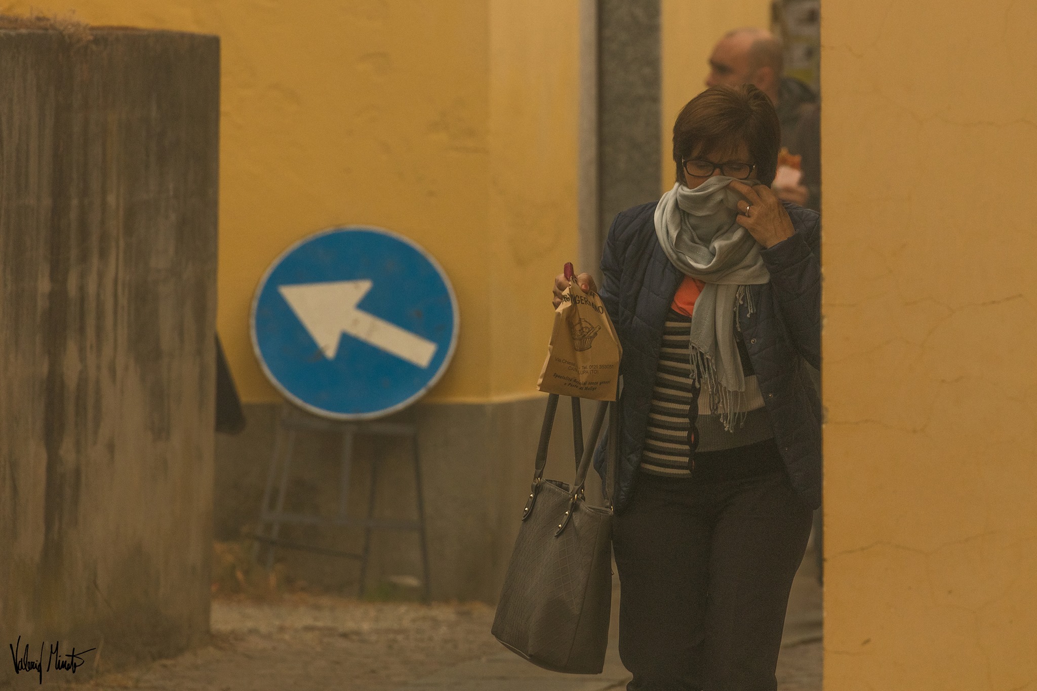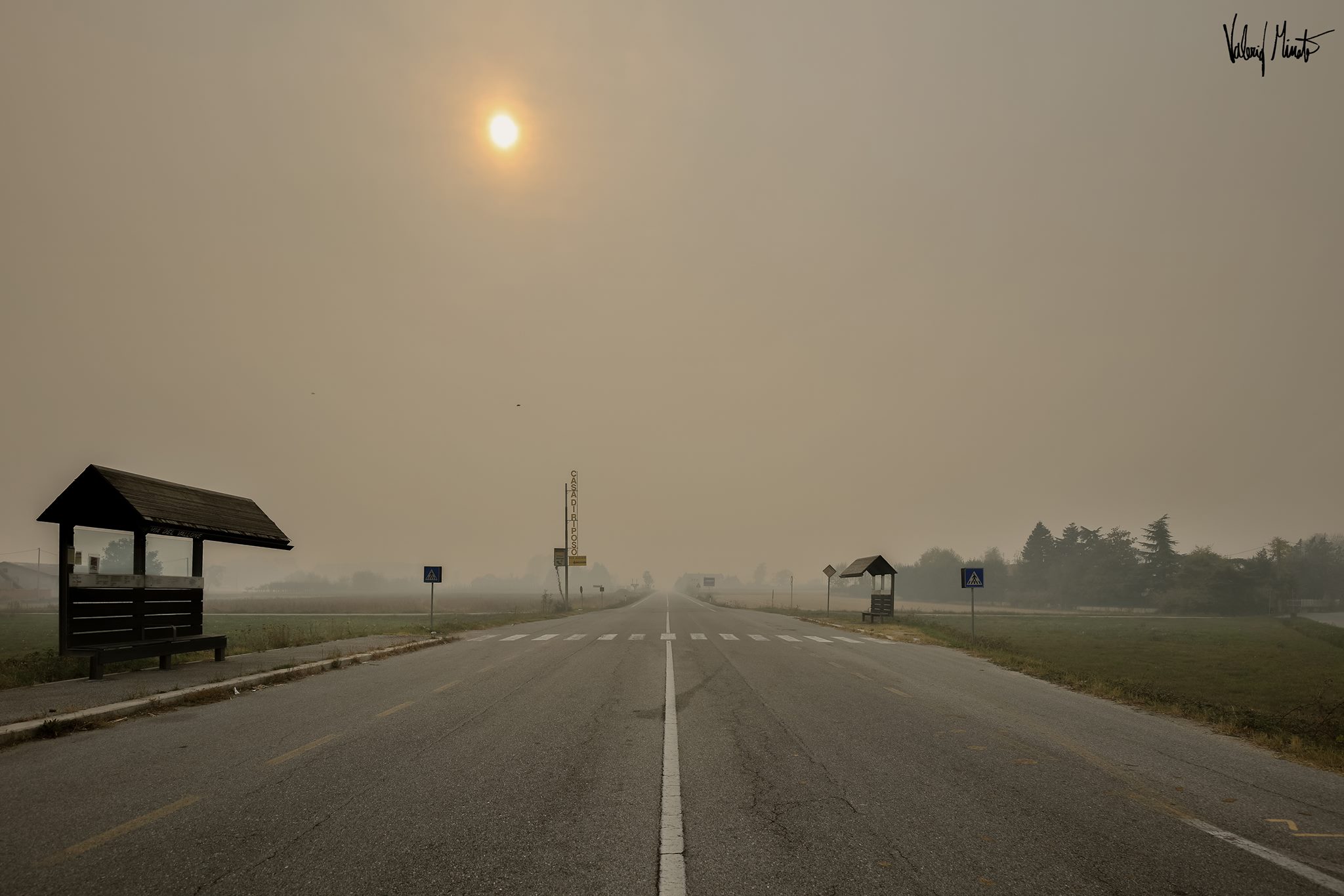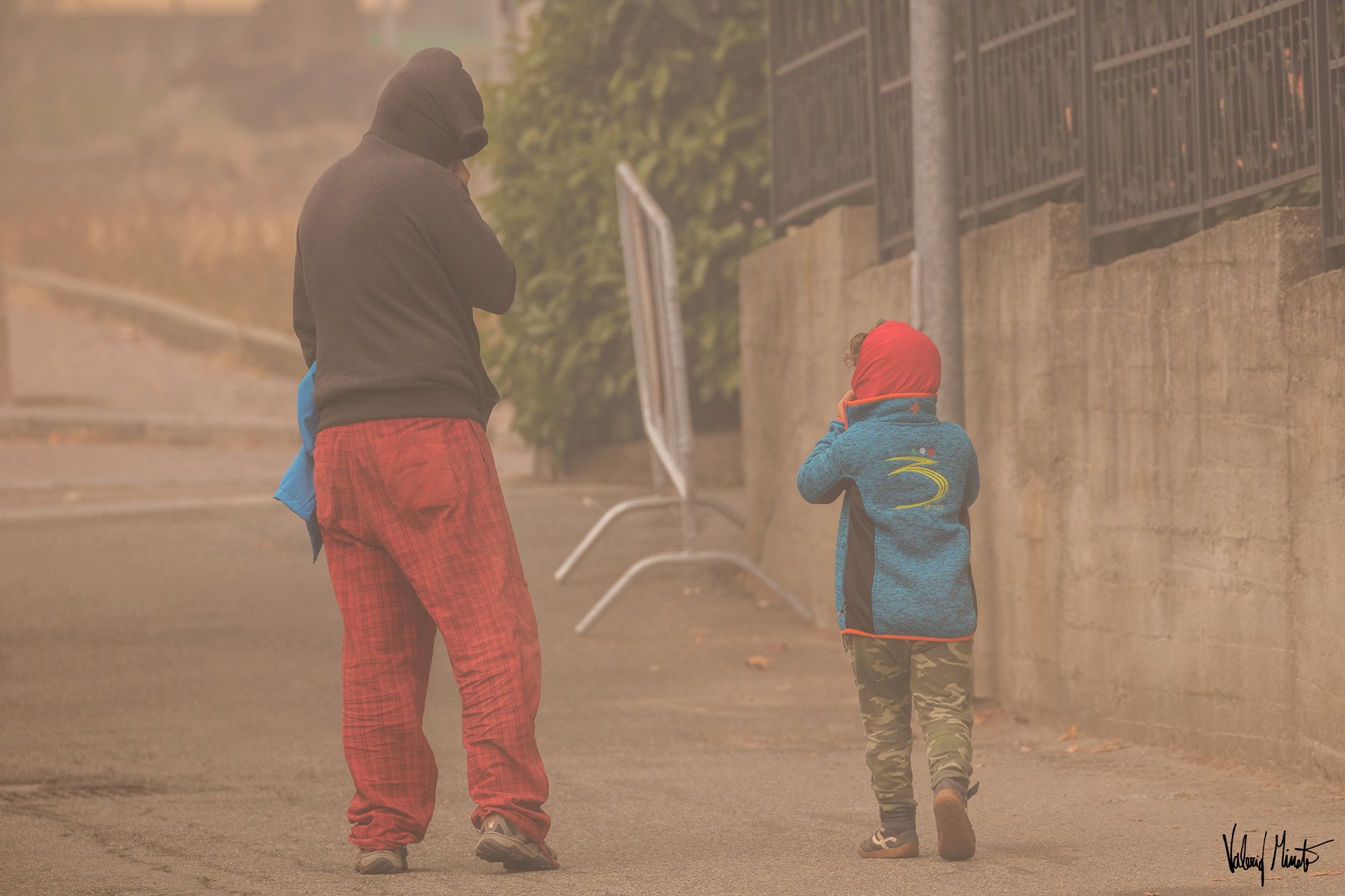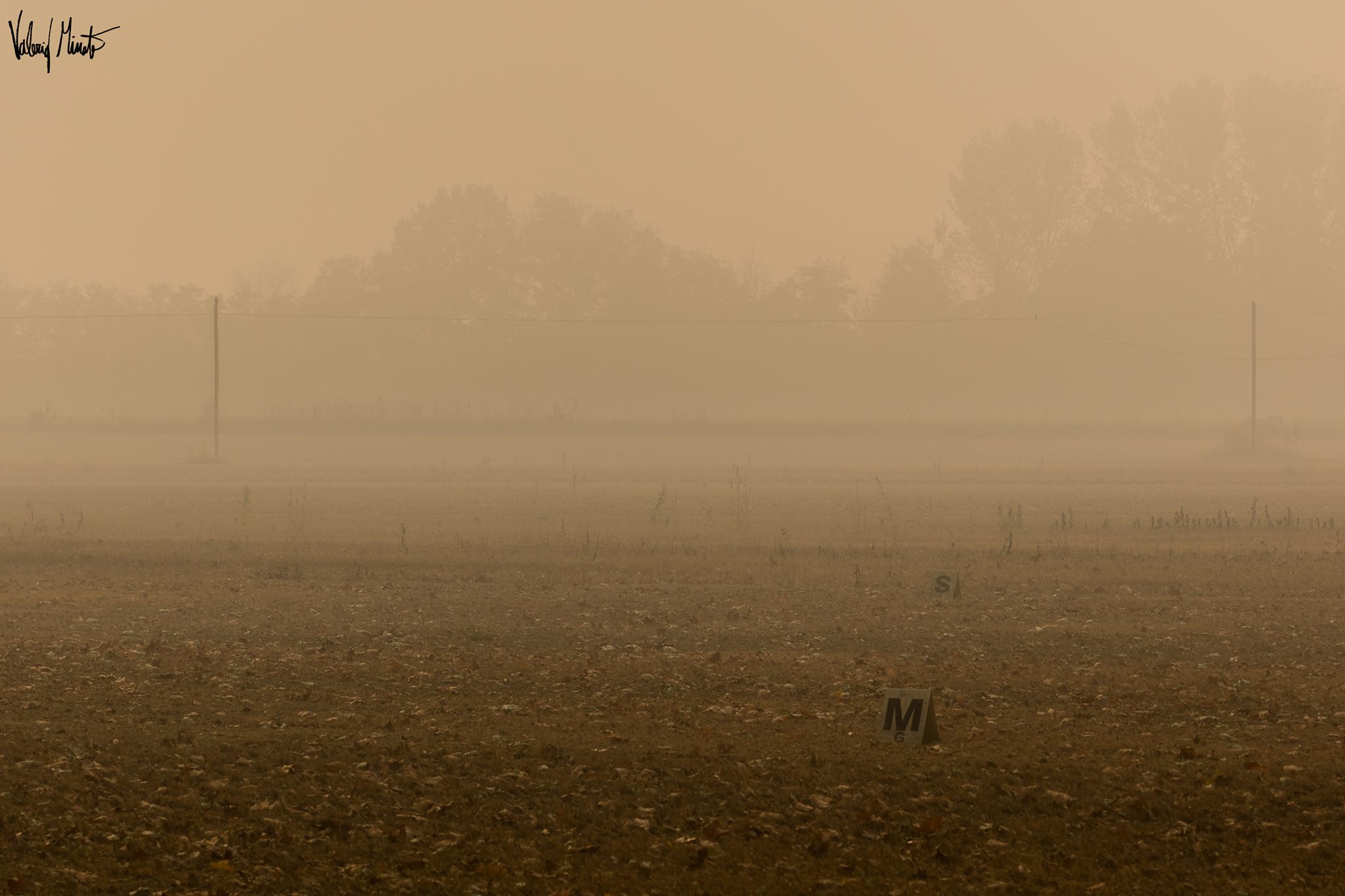 Il fumo avvolge tutto, la fuliggine si deposita ovunque, l’odore si impregna sulla pelle e sui vestiti, dopo un paio d’ore di scatti iniziavano a bruciare gli occhi. Passato Pinerolo sono salito verso Frossasco e Cantalupa. Non mi sono spinto fino agli incendi, non sono attrezzato, non volevo correre rischi inutili e oltretutto rischiare di intralciare le vetture dei Vigili del fuoco che continuano ad andare su e giù cercando di salvare il salvabile… il parco giochi di Cantalupa fuori dalla scuola elementare ovviamente deserto, i bambini che escono da scuola coprendosi alla bell’e meglio naso e bocca. Il sole spento sulle teste è l’emblema della gravissima situazione.