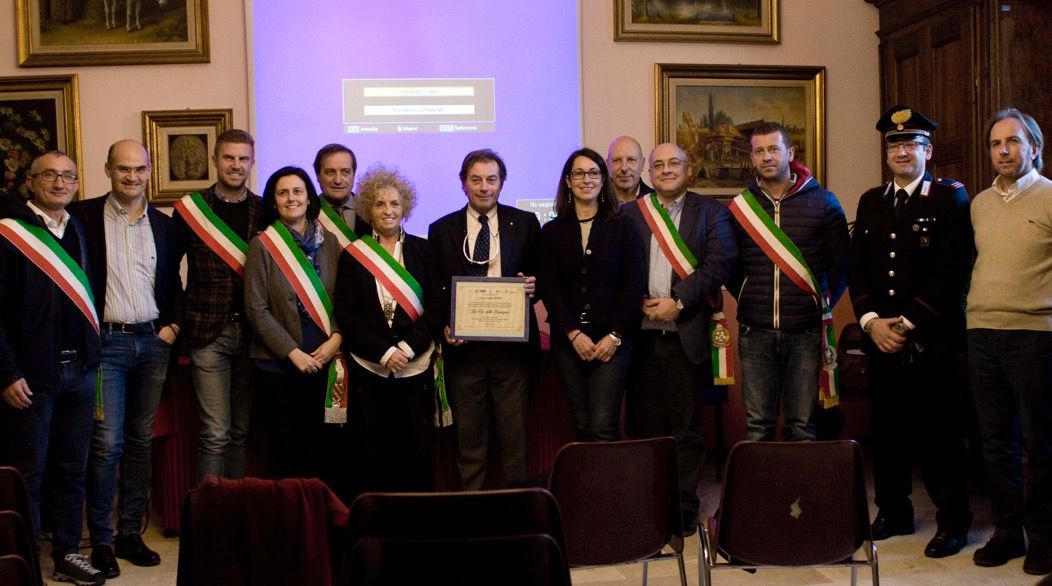 Sabato 18 novembre nella sala consiliare del Comune di Villafranca Piemonte è stata inaugurata ufficialmente la nuova pista ciclabile Airasca-Moretta, nota anche come “Via delle Risorgive”, realizzata sull’ex sedime della storica ferrovia Airasca-Saluzzo. All’inaugurazione la Città Metropolitana di Torino era rappresentata ufficialmente dalla Consigliera Anna Merlin, delegata agli Affari istituzionali, affari e servizi generali, gare e contratti, comunicazione istituzionale, turismo, relazioni e progetti europei ed internazionali. Era presente anche l’ingegner Luigi Spina, dirigente dei Servizi Viabilità 1 e Impianti tecnologici e gestione energia della Città Metropolitana, che ha curato insieme ai colleghi e collaboratori la progettazione della pista ciclabile e che il 24 novembre lascerà il servizio attivo avendo raggiunto il limite di età per il pensionamento. Nella foto con le autorità presenti a Villafranca, l’ingegner Spina riceve una targa a riconoscimento dell’impegno progettuale suo e dei collaboratori (foto Alice Ballari per il settimanale “L’Eco del Chisone”).