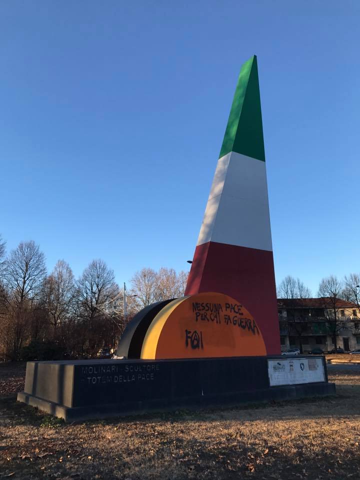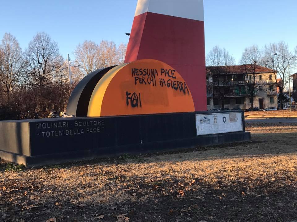 “Nessuna pace per chi fa guerra”. Firmato: Fai. Così recitano le parole che alcuni militanti della Federazione anarchica italiana hanno scritto sulla scultura.