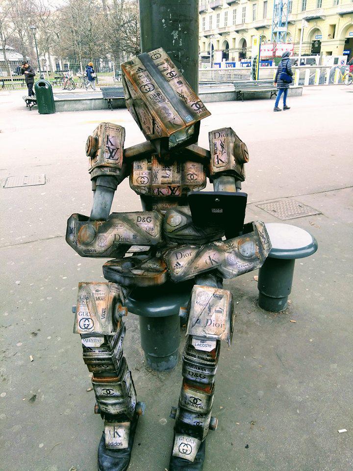 Lusso e senza tetto, cartone e robot. Sono gli ingredienti delle due nuove istallazioni del collettivo Labadanzky apparse a Torino nella notte tra lunedi 15 e martedì 16 gennaio. Si tratta di due robot-clochard di cartone, con la particolarità che il loro corpo è completamente cosparso di loghi di marchi famosi, da D&G a Calvin Klein, da Dior ad Adidas.