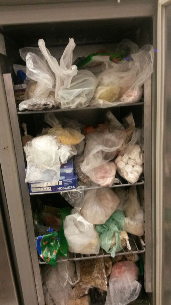 Nella cucina, in un frigo congelatore a colonna, sono stati rinvenuti alimenti di vario genere, per circa 50 Kg. di carne e pesce, in parte surgelati all’origine e in parte acquistati freschi ma portati arbitrariamente a congelazione senza utilizzare un’adeguata strumentazione.