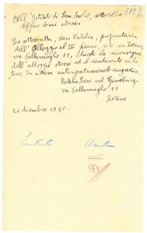 «A Torino ho abitato in quattro luoghi, ma per me Torino è soprattutto via Pallamaglio» amava dire la scrittrice. L’abitazione era stata sequestrata durante il secondo confllitto mondiale. I documenti che la Fondazione 1563 conserva in archivio e che ha reso disponibili online testimoniano la restituzione della casa a Natalia Ginzburg dopo la fine della guerra. Le pagine contengono l’inventario di ciò che era contenuto all’interno delle stanze nonché la lettera autografa con cui la scrittrice chiedeva la restituzione il 20 Dicembre 1945.