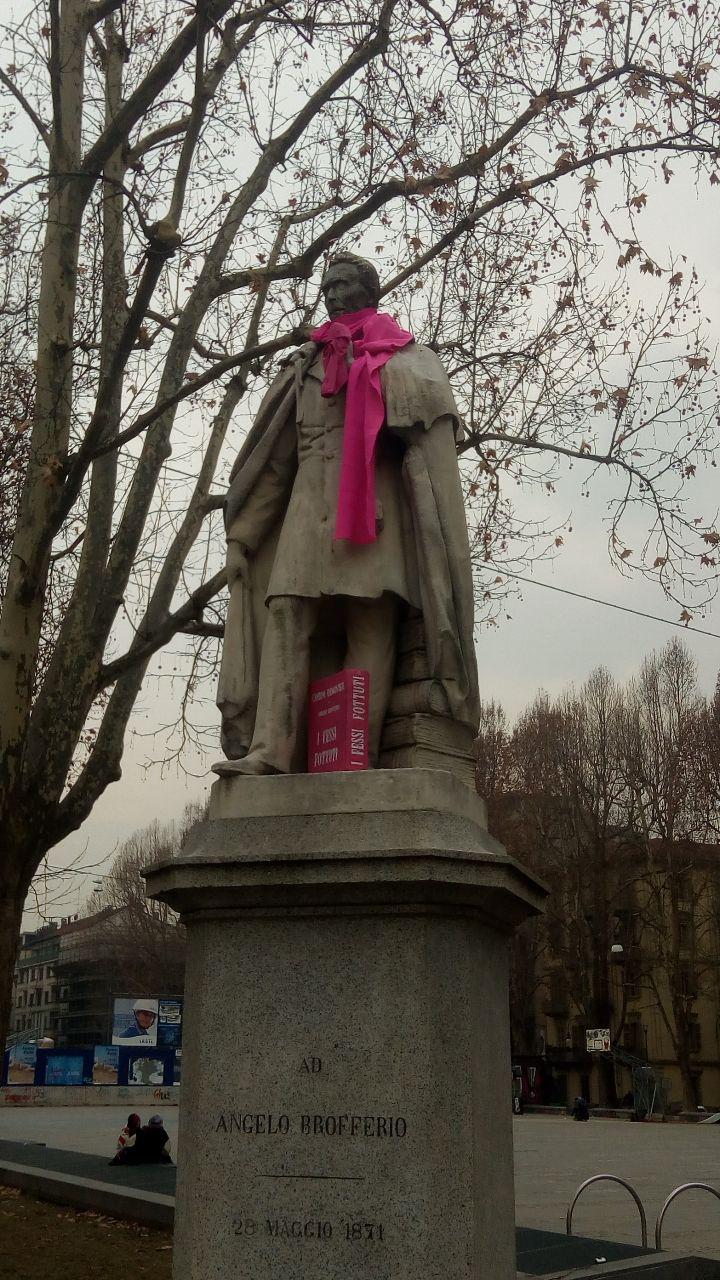 Nuovo colpo della Pantera Rosa di Torino. L’artista che ormai sappiamo essere Rebor questa volta ha colpito la statua dedicata ad Angelo Brofferio in piazza Arbarello. Una sciarpa rosa al collo ed un volume aggiunto tra i piedi, sempre rosa, che porta come titolo “Fessi fottuti” e come autore lo stesso Brofferio.