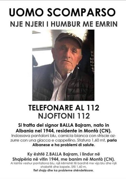 L’appello ci è arrivato direttamente dalla nipote del signor Balla Bajram, classe 1944 malato di Alzheimer. L’anziano è scomparso il 10 luglio scorso verso le 11 da Montà d’Alba (Cn). Al momento della scomparsa indossava dei pantaloni blu, una camicia bianca con strisce azzurre, una giacca e un cappellino. Il signor Bajram è alto 1,60 m e parla albanese. Se lo avvistate, chiamate immediatamente il 112.