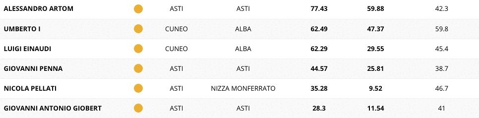A Torino il primo liceo classico resta il Cavour seguito a breve distanza da Alfieri e D’Azeglio. Fuori dal capoluogo spiccano il Baldessano Roccati di Carmagnola il Peano di Cuneo e il Bodoni a Saluzzo