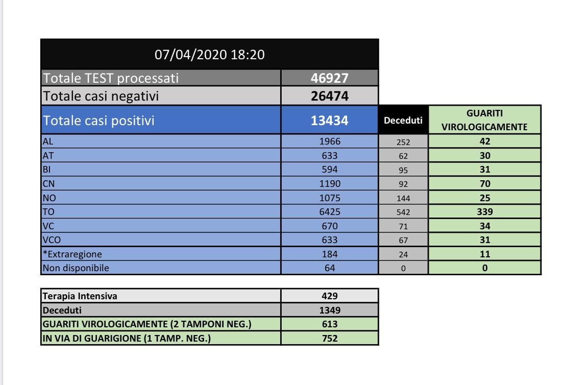 Il totale complessivo è ora di 1.349 deceduti risultati positivi al virus, così suddivisi su base provinciale: 252 ad Alessandria, 62 ad Asti, 95 a Biella, 92 a Cuneo, 144 a Novara, 542 a Torino, 71 a Vercelli, 67 nel Verbano-Cusio-Ossola, 24 residenti fuori regione, ma deceduti in Piemonte.