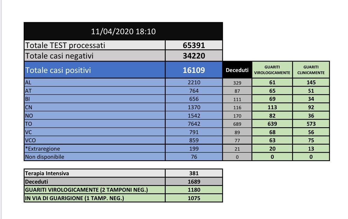 Coronavirus Piemonte. Il punto della situazione alle 19 dell’11 aprile 2020: rispetto a ieri +98 decessi, +159 guariti