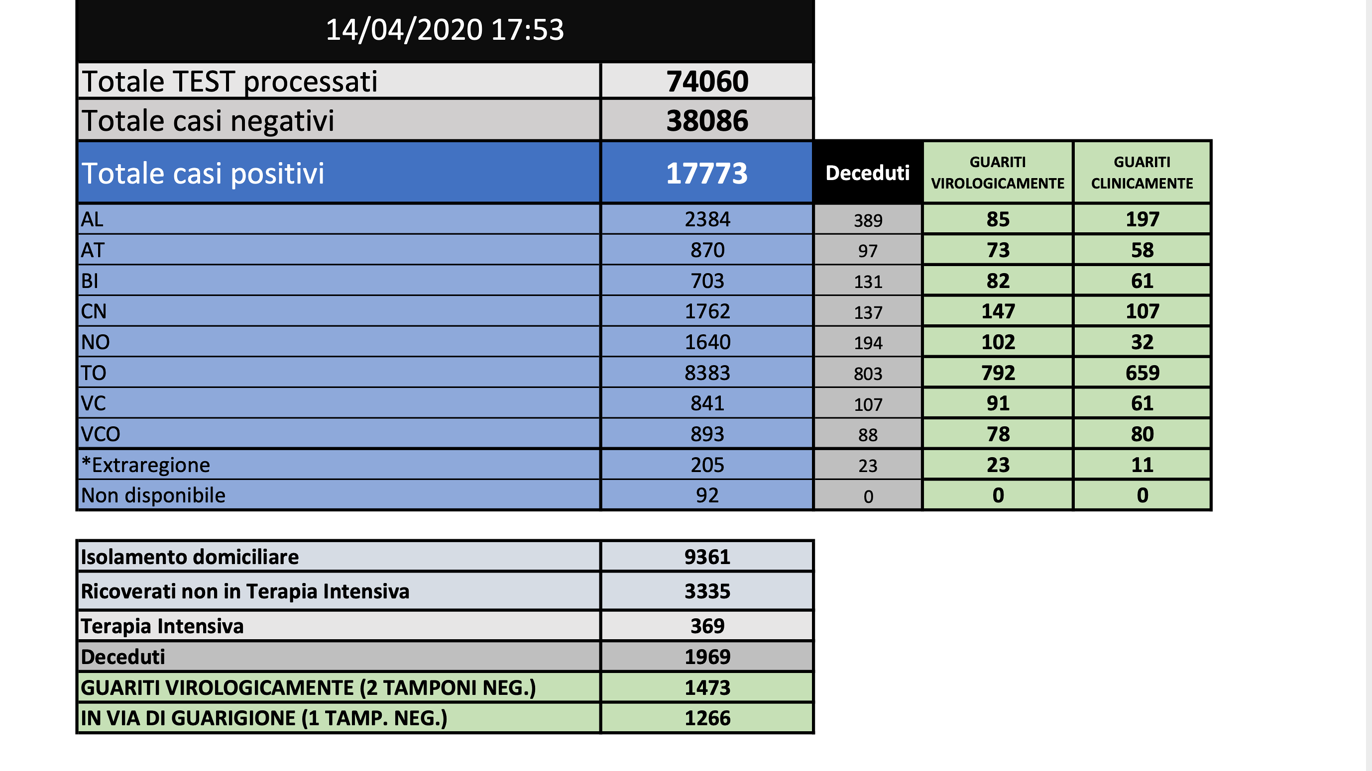 Il totale complessivo è ora di 1.969 deceduti risultati positivi al virus, così suddivisi su base provinciale: 389 ad Alessandria, 97 ad Asti, 131 a Biella, 137 a Cuneo, 194 a Novara, 803 a Torino, 107 a Vercelli, 88 nel Verbano-Cusio-Ossola, 23 residenti fuori regione, ma deceduti in Piemonte.
