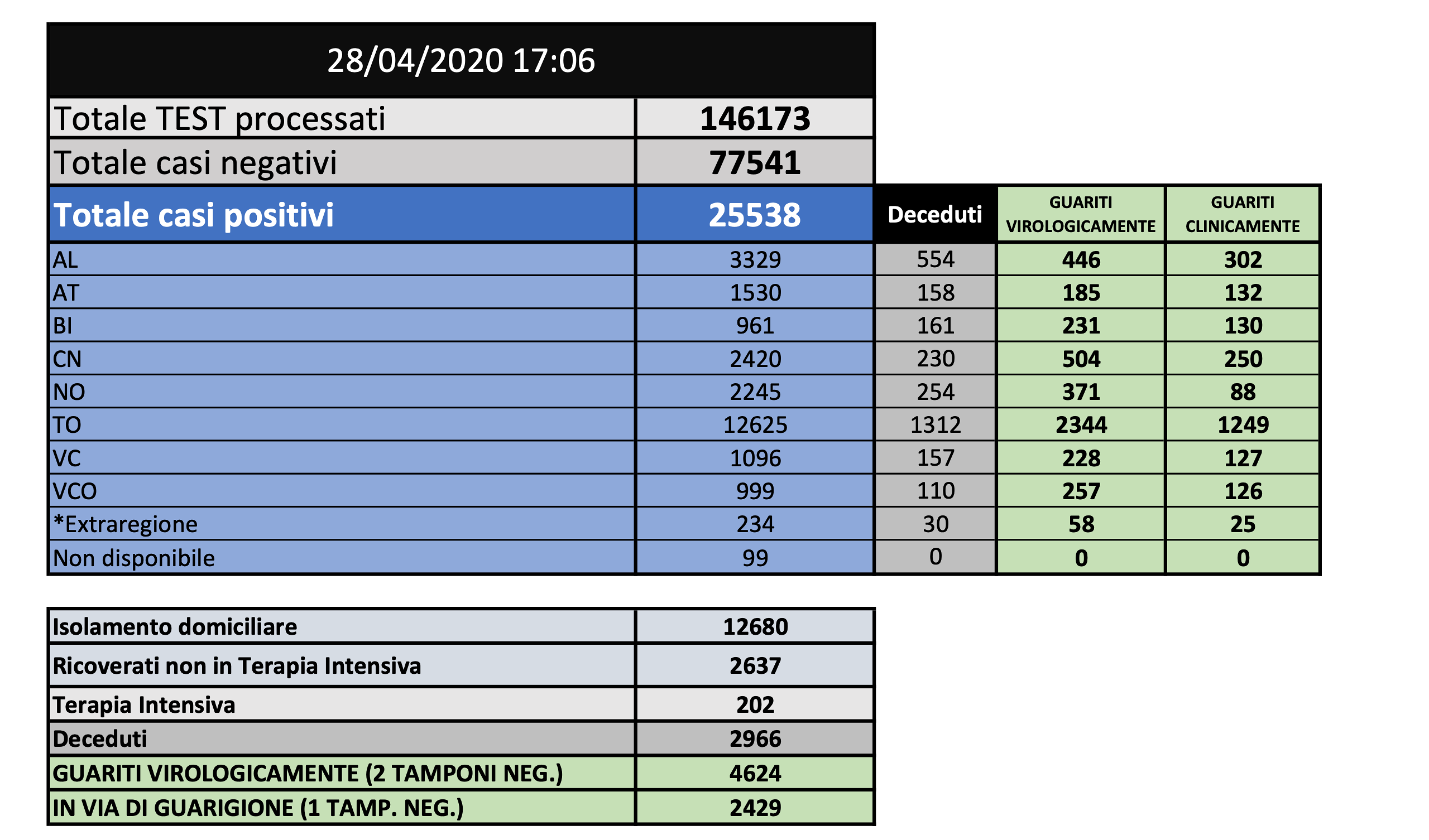 Il totale è ora di 2.966 deceduti risultati positivi al virus, così suddivisi su base provinciale: 554 ad Alessandria, 158 ad Asti, 161 a Biella, 230 a Cuneo, 254 a Novara, 1.312 a Torino, 157 a Vercelli, 110 nel Verbano-Cusio-Ossola, 30 residenti fuori regione, ma deceduti in Piemonte.
