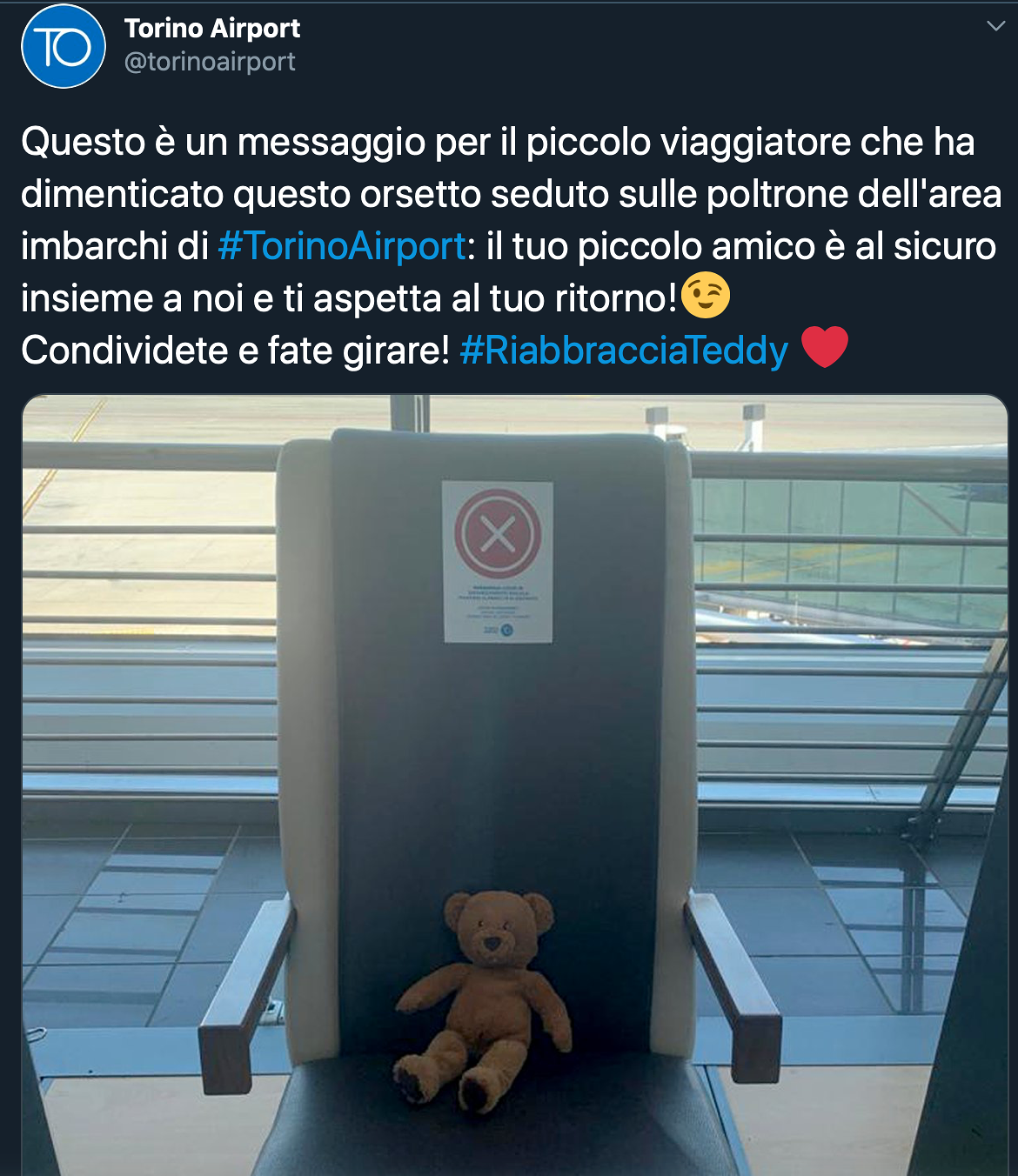 “Questo è un messaggio per il piccolo viaggiatore che ha dimenticato questo orsetto seduto sulle poltrone dell’area imbarchi di #TorinoAirport – si legge – il tuo piccolo amico è al sicuro insieme a noi e ti aspetta al tuo ritorno!Condividete e fate girare! #RiabbracciaTeddy