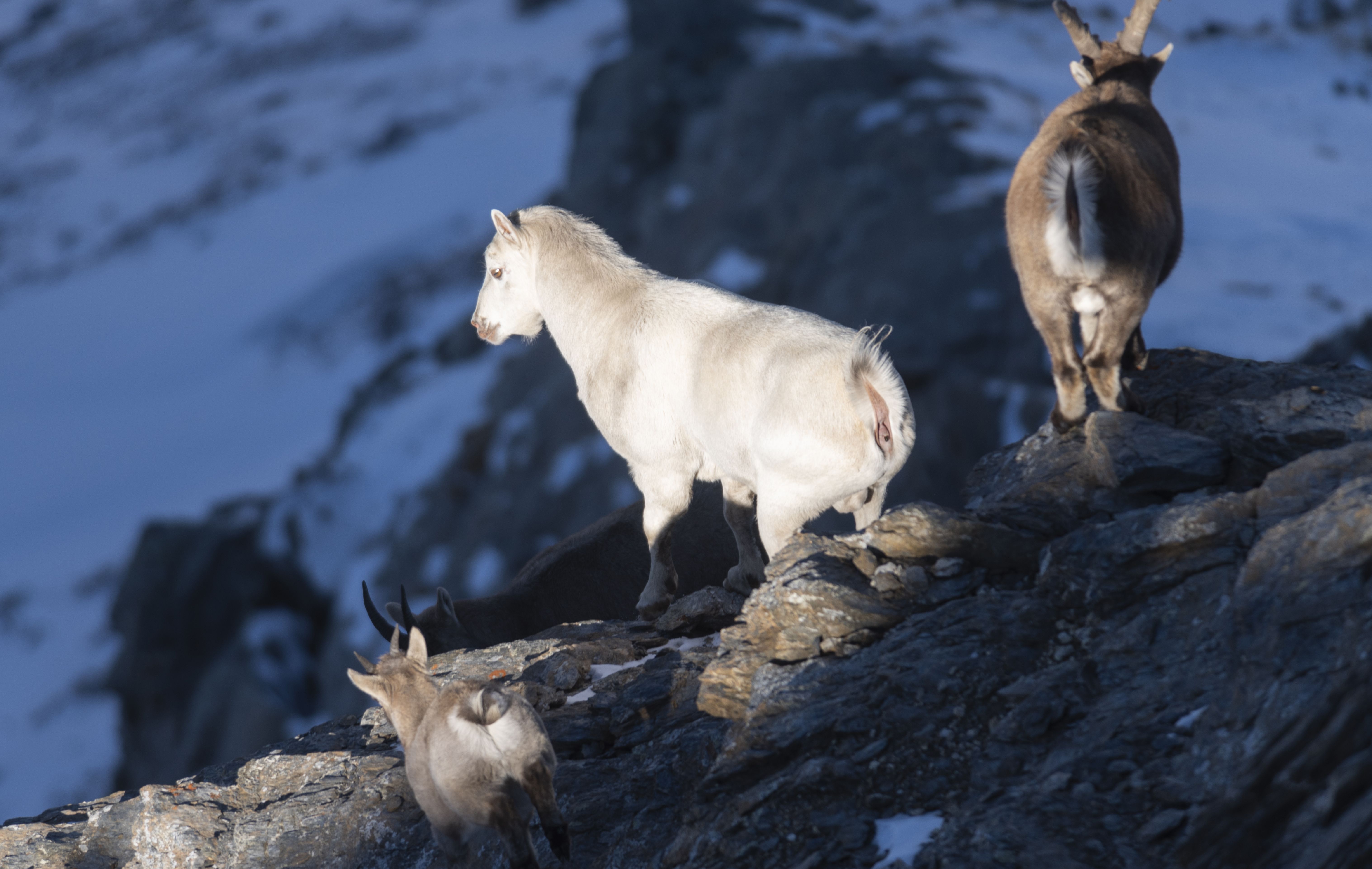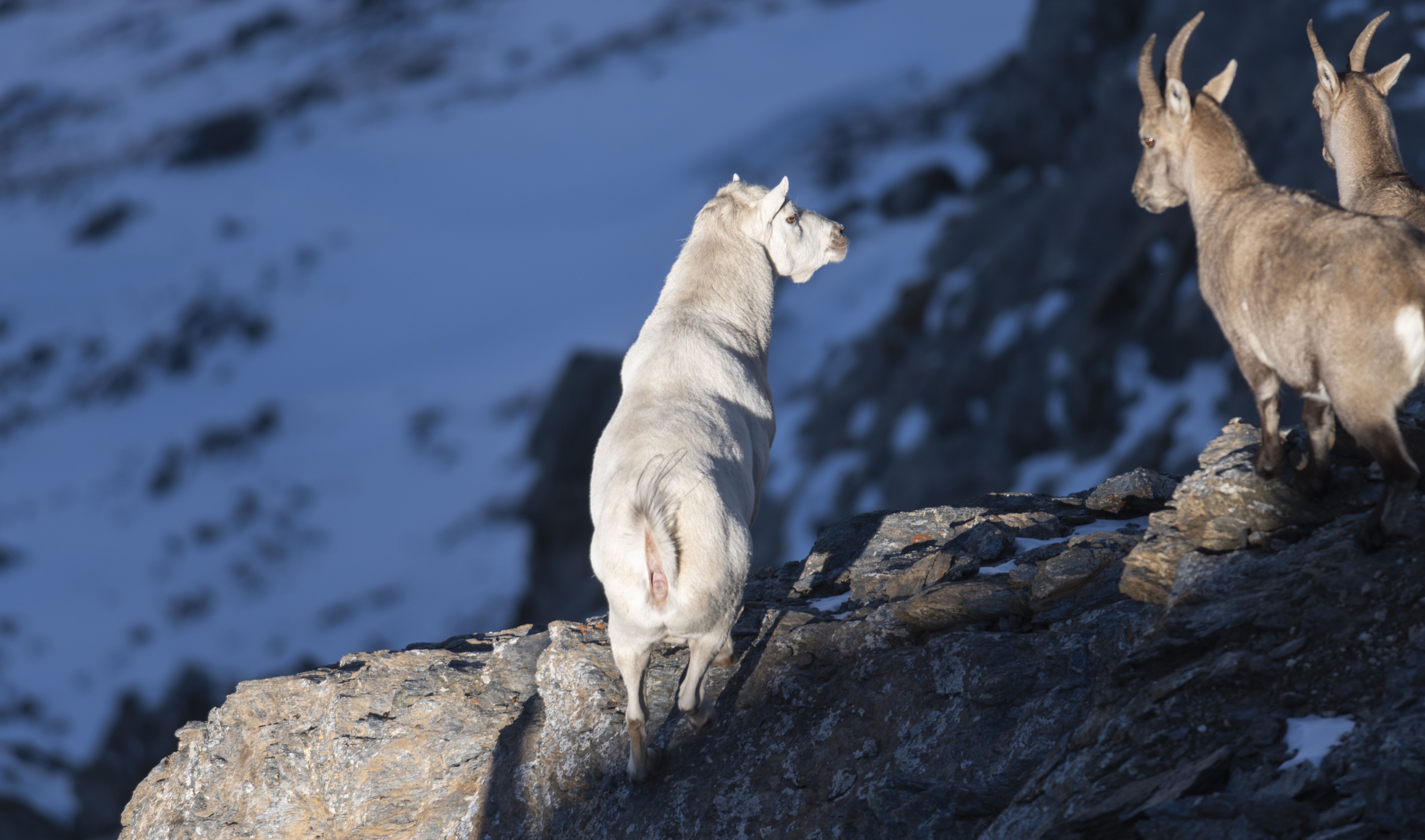 Giunti sul posto, gli agenti della Città Metropolitana e il professor Rosi hanno avvistato in un branco di Stambecchi un maestoso esemplare maschio adulto dal mantello bianco e senza corna. Il professor Rossi, dopo un’attenta osservazione, ha definito l’animale come leucista, ovvero affetto da leucismo (dal greco “leucos”, cioè bianco), un’anomalia genetica che a differenza dell’albinismo, lascia le pupille degli occhi pigmentate. Un mantello bianco rappresenta un grosso problema per gli animali selvatici, in quanto elimina il loro naturale mimetismo e rende tali animali più individuabili dai predatori ed espone anche il branco a rischi maggiori. Generalmente gli animali leucisti vengono allontanati dal gruppo, cosa che in questo caso non è avvenuta. Anzi, l’animale manifesta atteggiamenti da leader. La scoperta ha lasciato piacevolmente sorpresi gli esperti di fauna selvatica, in quanto è un fatto straordinario come un animale, cosi evidente, sia riuscito a passare inosservato per diversi anni.