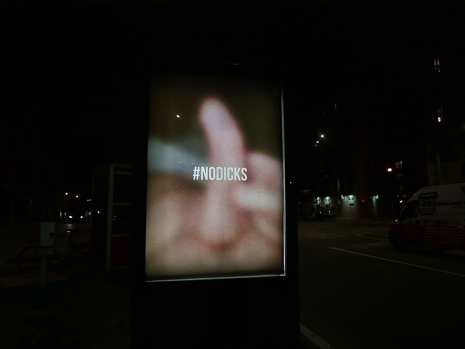 Con i manifesti #nodicks ho chiesto alle mie fan su Instagram di inviarmi le foto di peni non richieste che hanno ricevuto in chat da maniaci o sconosciuti. Ho poi stampato i peni sfocandoli e li ho affissi in strada.