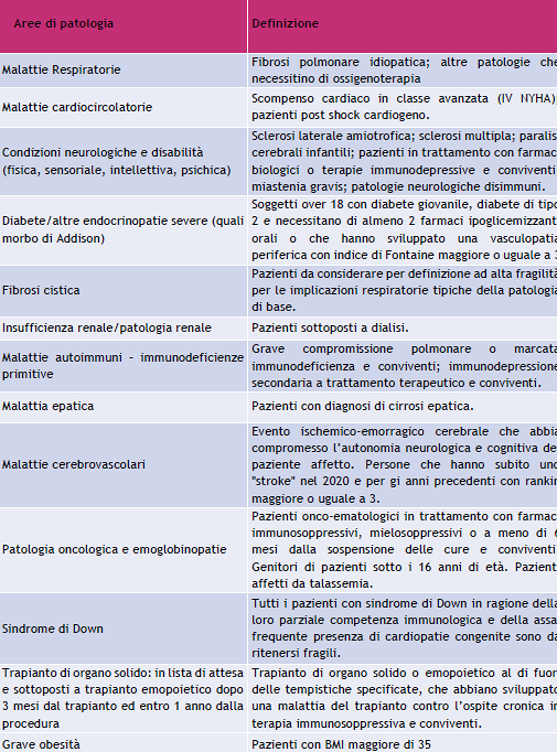 Sempre lunedì 15 marzo partirà la prenotazione delle vaccinazioni anche per le persone che si trovano in condizione di estrema vulnerabilità. Rientrano in questa condizione coloro che sono affetti da una delle 13 patologie indicate dal piano nazionale:
