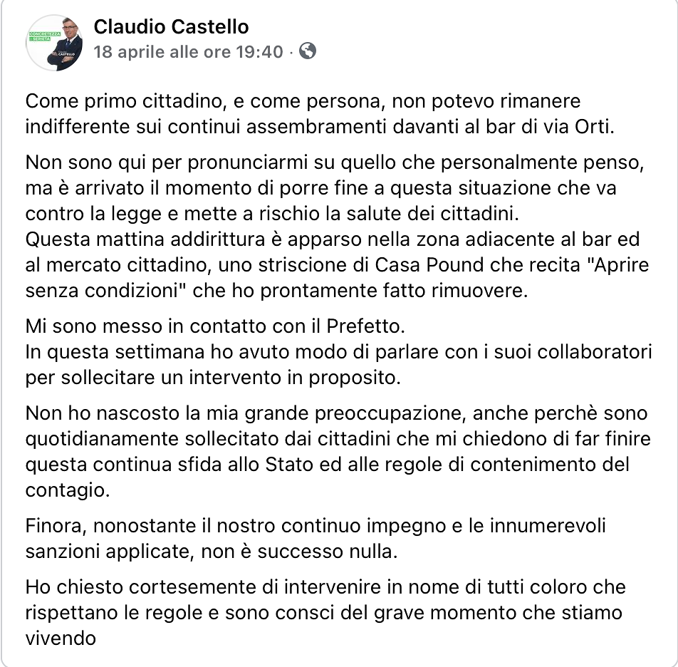 “Come primo cittadino, e come persona – aveva scritto Castello – non potevo rimanere indifferente sui continui assembramenti davanti al bar di via Orti. Non sono qui per pronunciarmi su quello che personalmente penso, ma è arrivato il momento di porre fine a questa situazione che va contro la legge e mette a rischio la salute dei cittadini. Questa mattina addirittura è apparso nella zona adiacente al bar ed al mercato cittadino, uno striscione di Casa Pound che recita “Aprire senza condizioni” che ho prontamente fatto rimuovere.