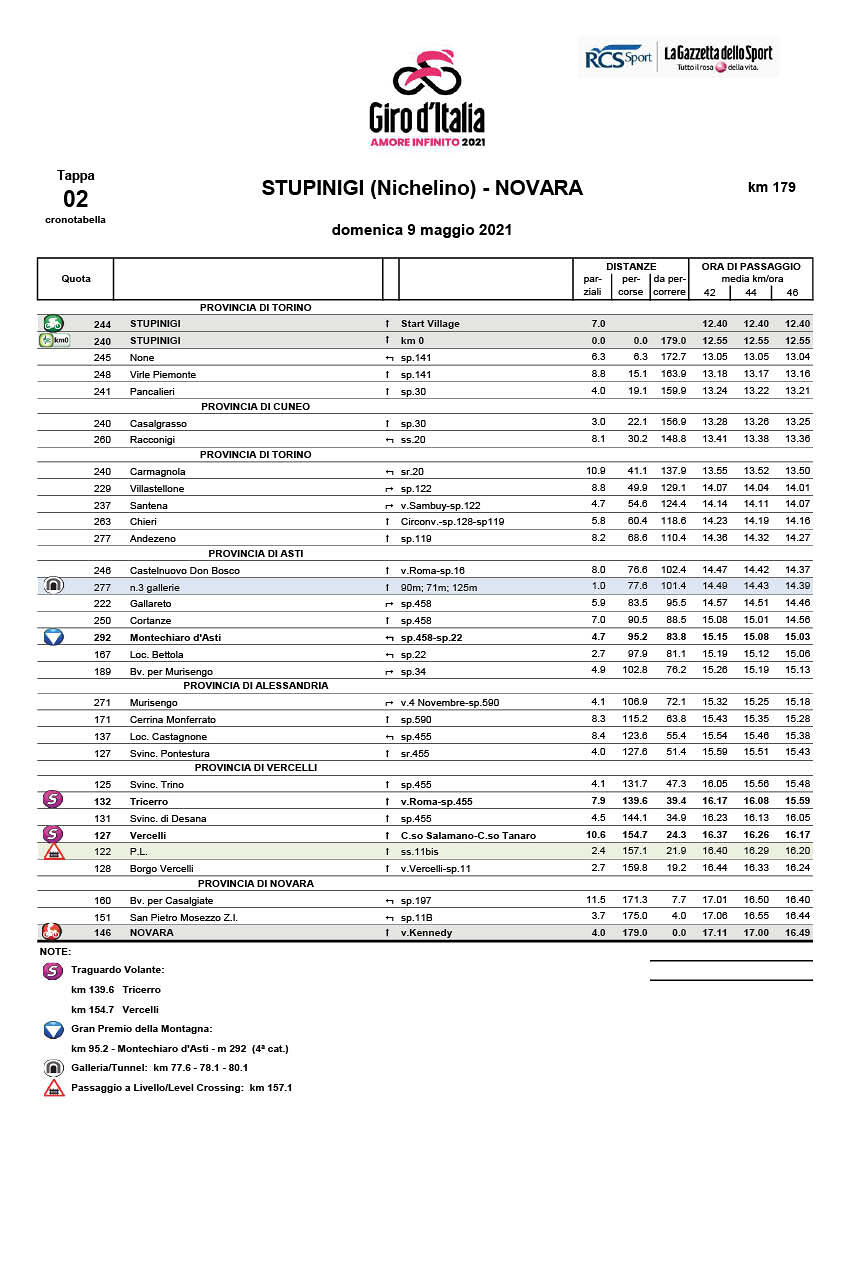 Dopo il successo di Filippo Ganna nella cronometro di Torino, il Giro d’Itali prosegue nelle sue giornate in Piemonte con la seconda tappa da Stupinigi a Novara per 179 chilometri da sud a nord.