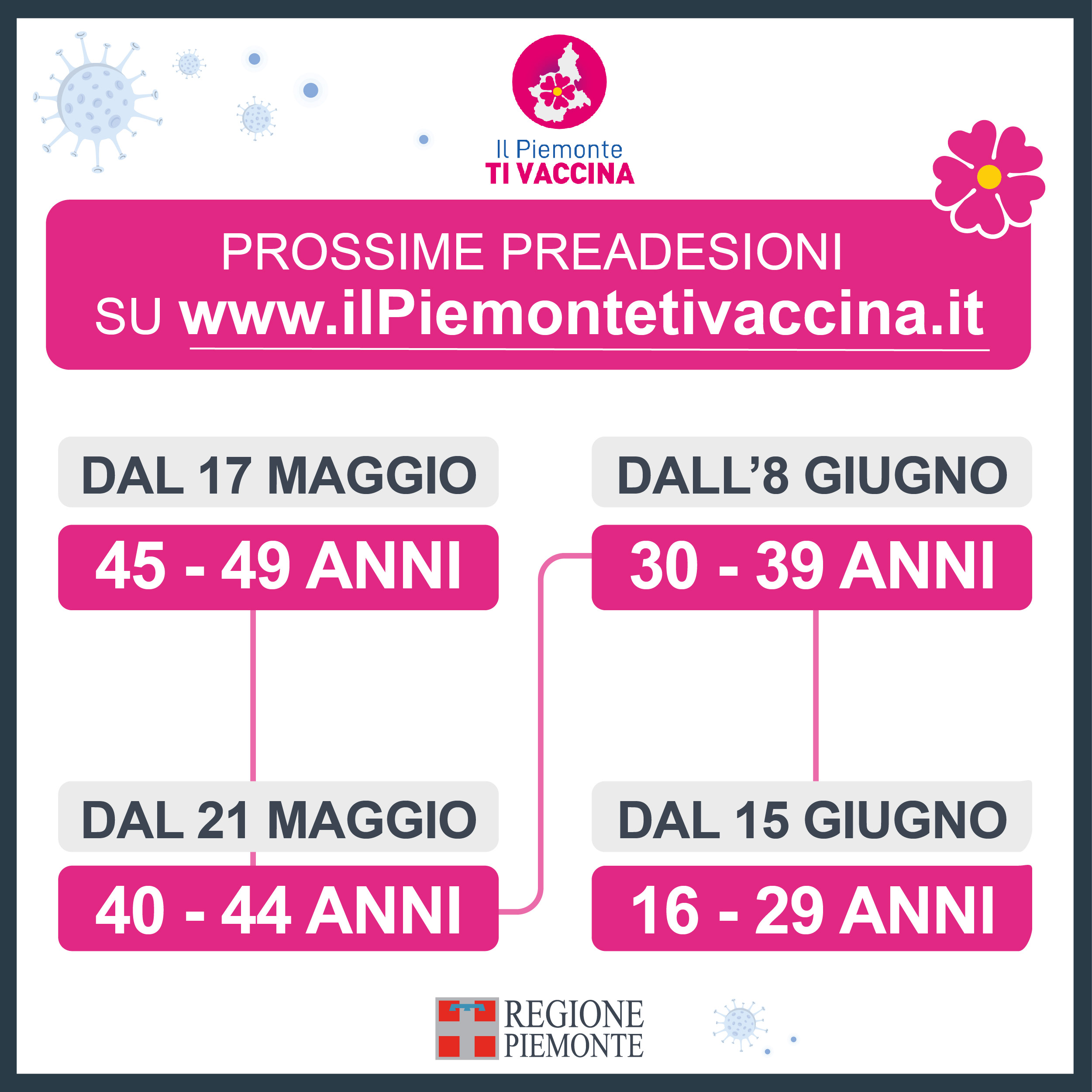 Si anticipano quindi in Piemonte le date delle preadesioni per questa fascia d’età: in particolare da lunedì 17 maggio potrà aderire sul portale www.IlPiemontetivaccina.it la fascia 45-49 anni e da venerdì 21 maggio la fascia 40-44 anni.