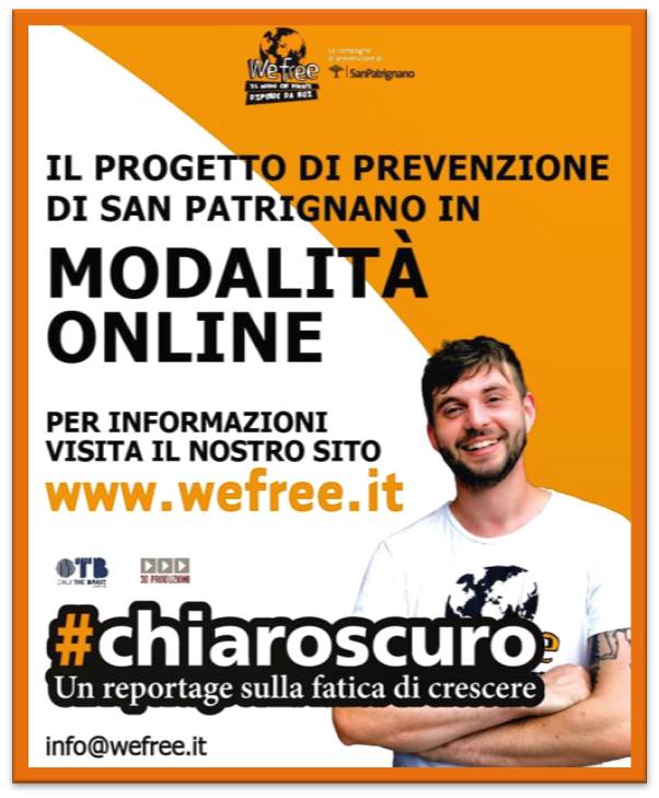 - i format di prevenzione #Chiaroscuro – Reportage sulla fatica di crescere, in cui Carolina, Melita e Federico – tre ragazzi che hanno svolto il percorso di recupero a San Patrignano e oggi si sono reinseriti – raccontano la loro storia, i loro errori, la vita ritrovata. Dopo la visione del documentario gli studenti parteciperanno al dibattito online con i giovani protagonisti, moderato dalle giornaliste Angela Iantosca e Micaela Palmieri;
