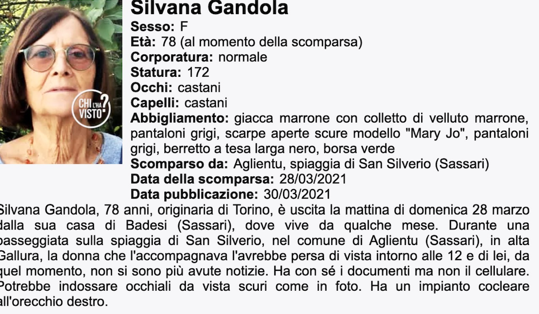 Appartengono a Silvana Gandola, l’anziana 78enne scomparsa il 28 marzo dalla spiaggia di San Silverio, tra Portobello e Vignola, in Gallura, i resti ritrovati ieri pomeriggio in Sardegna.