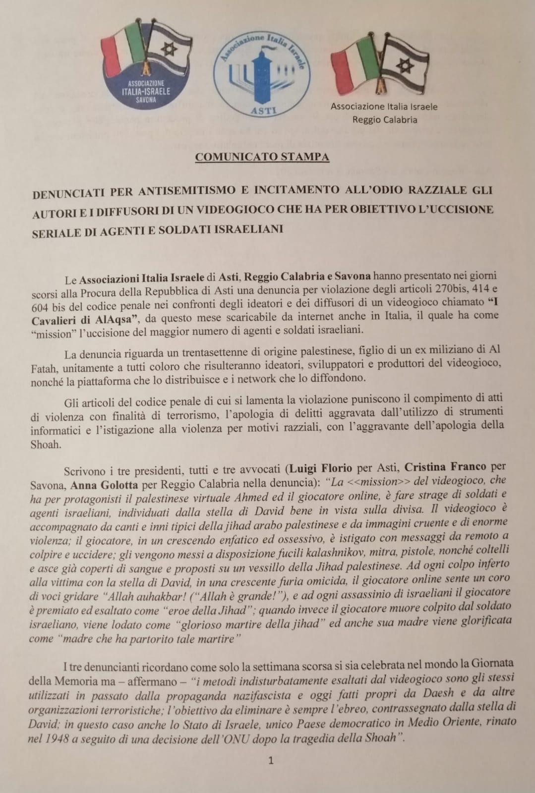 Le Associazioni Italia Israele di Asti, Reggio Calabria e Savona hanno presentato alla Procura della Repubblica di Asti una denuncia per violazione degli articoli 270bis, 414 e 604 bis del codice penale nei confronti degli ideatori e dei diffusori di un videogioco chiamato «I Cavalieri di AlAqsa», scaricabile da internet anche in Italia, il quale ha come obiettivo l’uccisione del maggior numero di agenti e soldati israeliani.