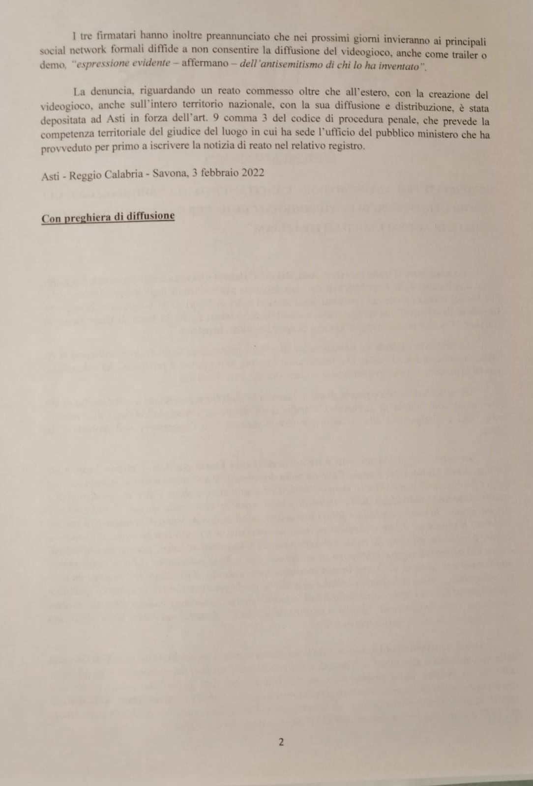 La denuncia riguarda un trentasettenne di origine palestinese, figlio di un ex miliziano di Al Fatah, unitamente a coloro che risulteranno ideatori, sviluppatori e produttori del videogioco, nonché la piattaforma che lo distribuisce e i network che lo diffondono.