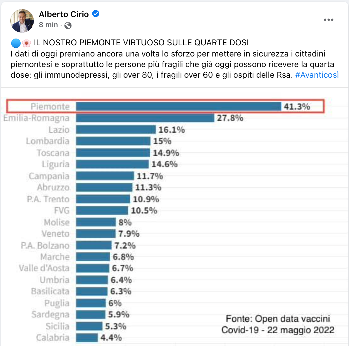 I dati di oggi, scrive Cirio premiano ancora una volta lo sforzo per mettere in sicurezza i cittadini piemontesi e soprattutto le persone più fragili che già oggi possono ricevere la quarta dose: gli immunodepressi, gli over 80, i fragili over 60 e gli ospiti delle Rsa.