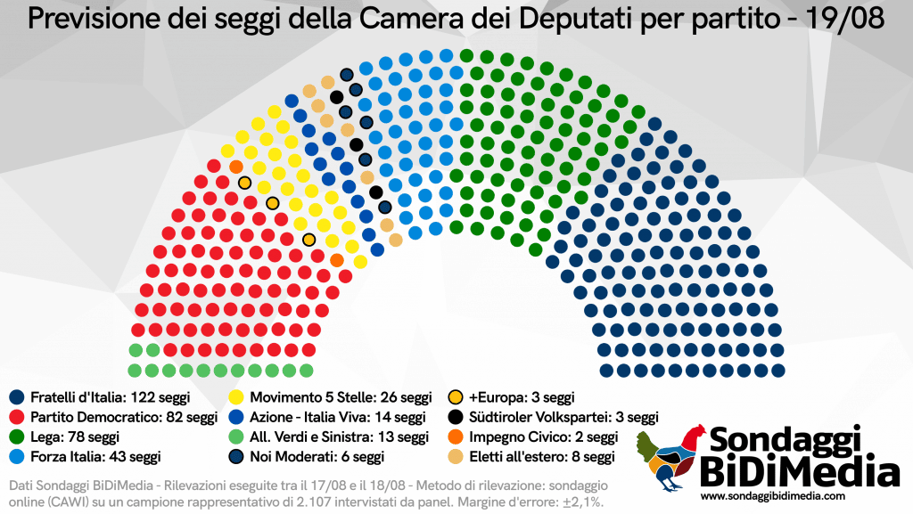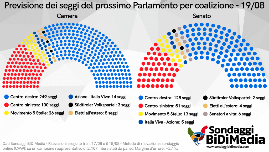 Il Centrosinistra sarebbe prima forza di opposizione con 100 seggi alla Camera, mentre i 5 Stelle, attuale gruppo di maggioranza relativa, si dovrebbero accontentare di soli 26 seggi alla Camera. I liberali di Azione-Italia Viva non sono premiati dalla scelta di andare da soli: stanti gli attuali dati BiDiMedia, Calenda e Renzi avrebbero una risicata truppa di 14 Deputati e 5 Senatori, tutti ottenuti al proporzionale. Completano il parlamento virtuale la manciata di eletti delle minoranze linguistiche e all’estero, oltre ai 5 senatori a vita.