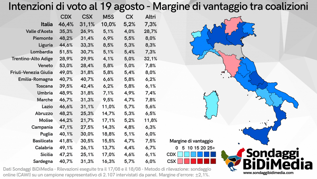La proiezione è basata sull’ultimo sondaggio nazionale BiDiMedia del 19/8, ripartendo il voto su base locale in base allo storico elettorale e dei sondaggi BiDiMedia.